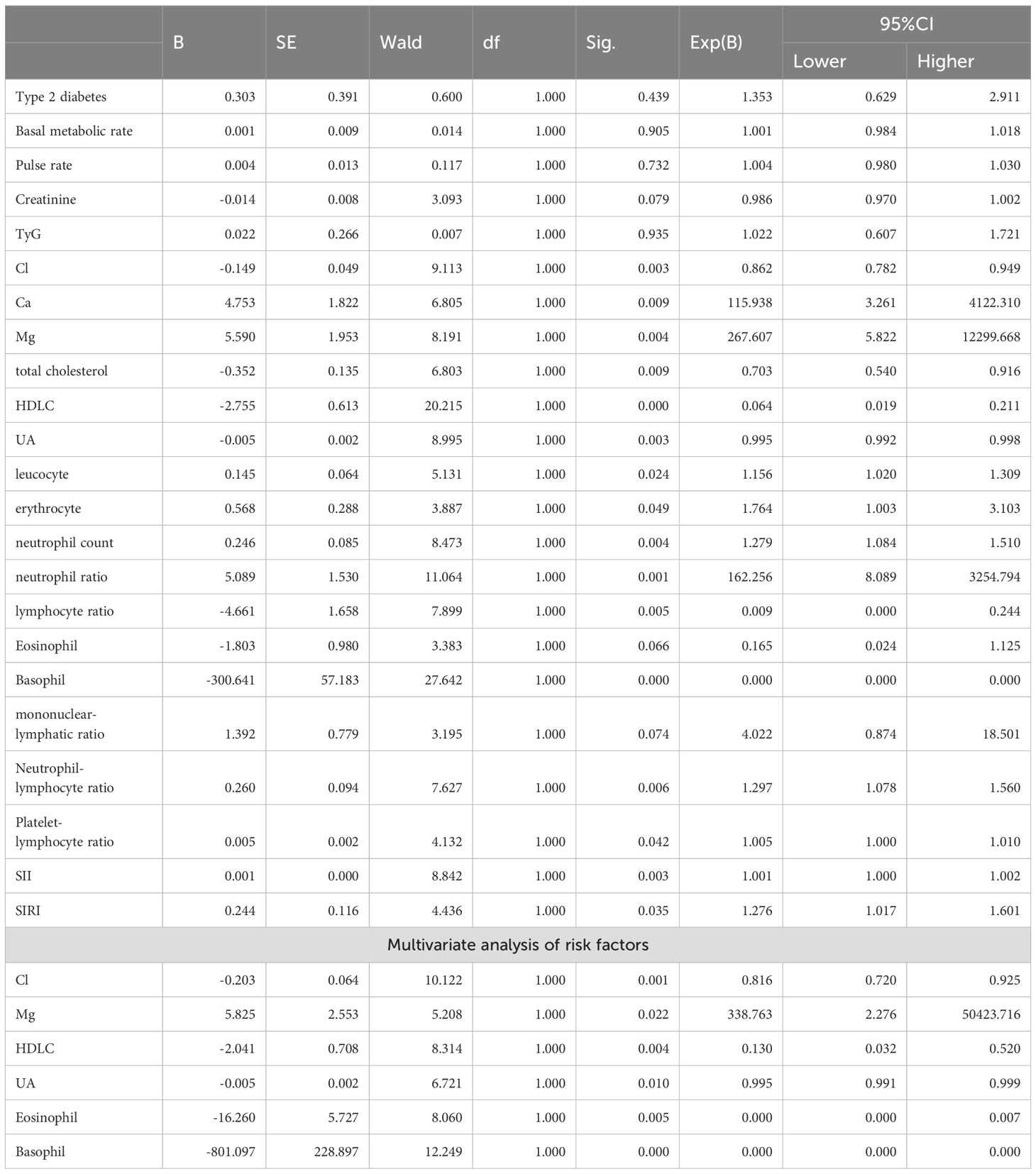The significance factors of univariate analysis were introduced into logistic regression for multivariate analysis and the following independent risk factors were obtained: Cl (P=0.001 HR=0.816, 95% CI 0.720-0.925), Mg (P=0.022 HR=338.763 95% CI 2.276-50423.716), HDLC (P= 0.004 HR=0.130, 95% CI 0.032-0.520), UA (P=0.010 HR=0.995 95% CI 0.991-0.999), Eosinophil (P=0.005 HR=0.000, 95% CI 0.000-0.007), Basophil (P<0.001 HR=0.000,95% CI 0.000-0.000).