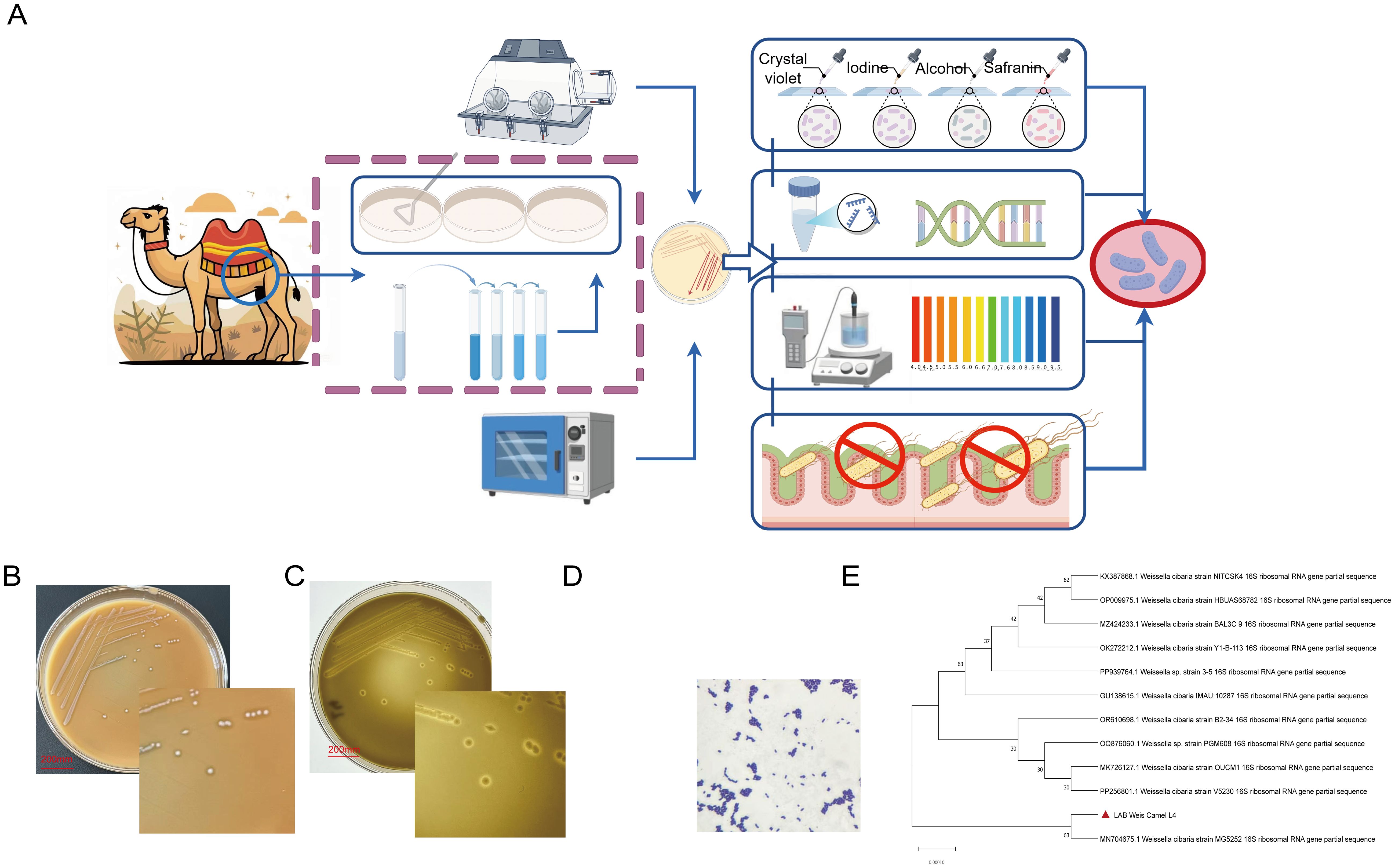 Figure 1. Weissella cibaria LAB_Weis_Camel_L4 isolation and identification. (A) Lactic acid bacteria dissociation identification process schematic diagram. (B) Formation of milky-white, smooth, circular colonies on MRS agar. (C) Calcium-dissolving zone (halo formation). (D) Gram-positive short bacilli. (E) Phylogenetic tree constructed based on the 16S rRNA gene.