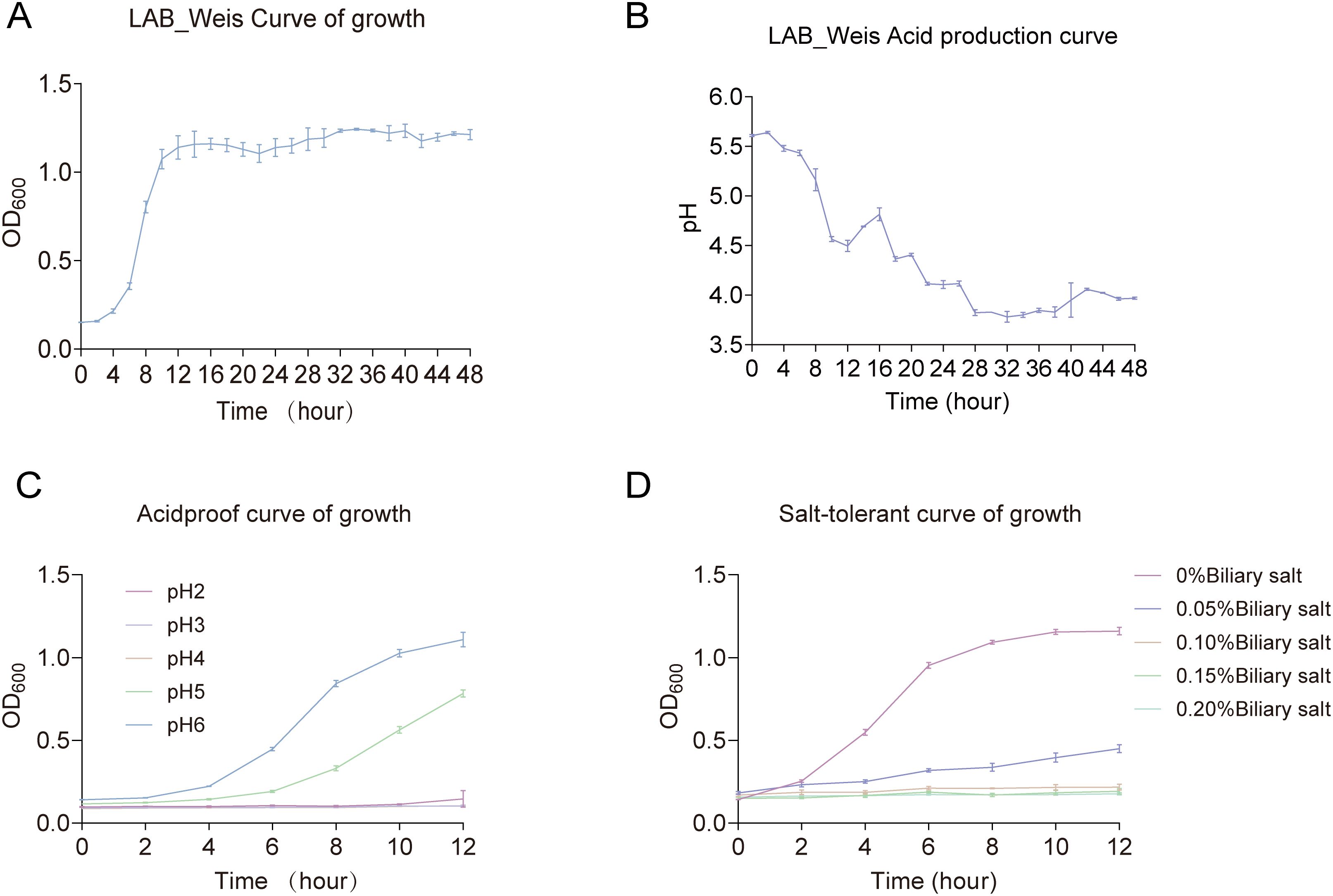Figure 2. Weissella cibaria LAB_Weis_Camel L4 growth characteristics. (A) Growth curve. (B) Acid production curve. (C) Acid tolerance growth curve. (D) Choline tolerance growth curve.