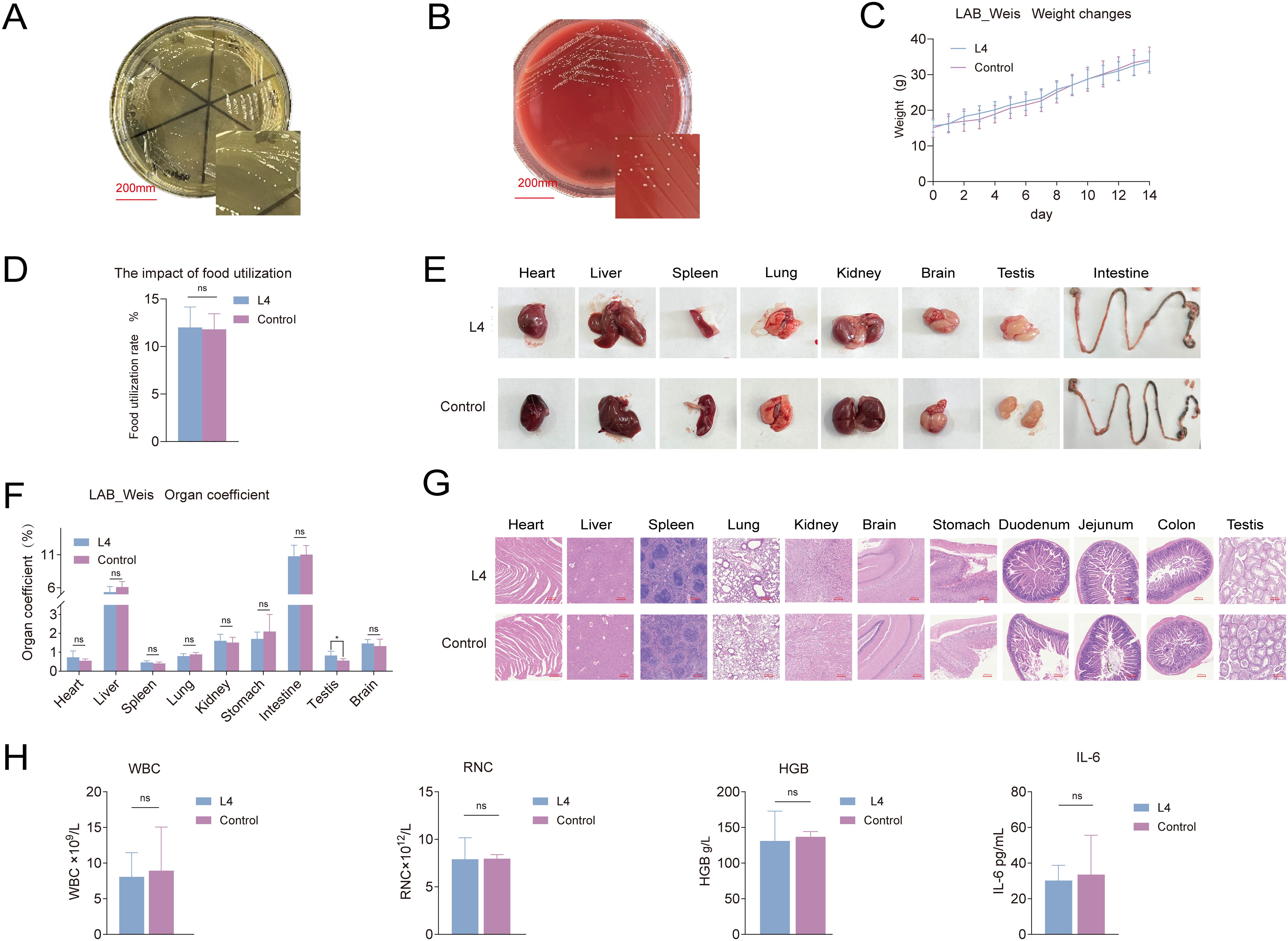 Figure 3. Weissella cibaria LAB_Weis_Camel_L4 safety evaluation. (A) H2O2 production assay. (B) No hemolysis observed. (C) Changes in mouse body weight. (D) Effect on food utilization rate in mice. (E) Changes in mouse tissues and organs. (F) Organto-body weight ratios in mice. (G) Histopathological HE changes in mouse tissues. (H) Hematological and inflammatory responses in mice, including effects on white blood cells WBC, hemoglobin HGB, red blood cells RBC, and the pro-inflammatory cytokine IL-6.