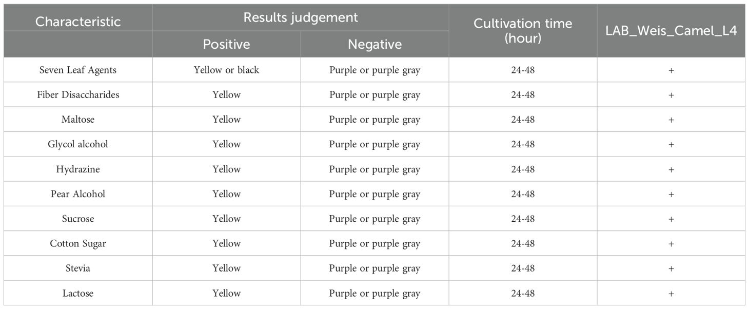 A strain designated LAB_Weis_Camel_L4 was isolated from camel rumen content samples. After 24 h of incubation at 37 °C on MRS agar, the bacterium produced milky-white, smooth colonies (Figure 1B) and displayed a calcium-dissolving zone (Figure 1C). Microscopic examination revealed Gram-positive short rod morphology (Figure 1D). Biochemical assays confirmed positive fermentation of glucose, maltose, and other carbohydrates (Table 1). Identification based on 16S rRNA gene sequencing and phylogenetic analysis (Figure 1E) classified the isolate within the genus Weissella.