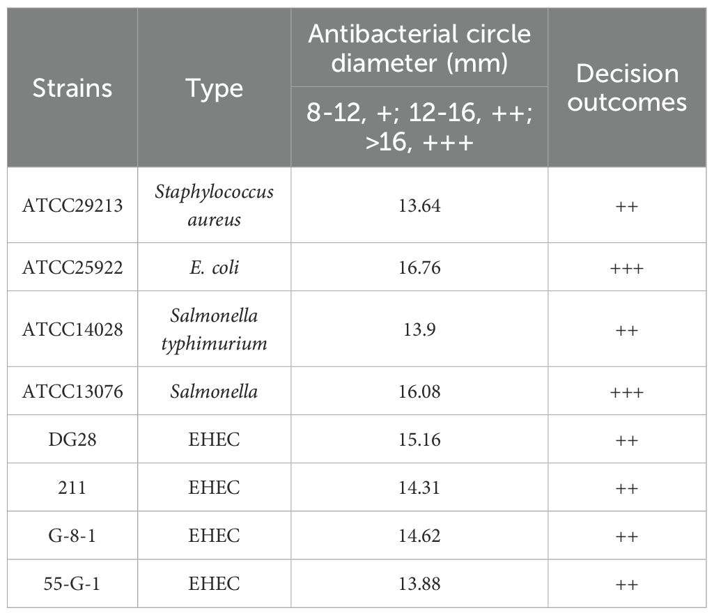 The antibacterial activity of Weissella was assessed using the agar diffusion method. Test strains included standard bacteria: E. coli ATCC 25922, Staphylococcus aureus ATCC 29213, Salmonella ATCC 13076, Salmonella Typhimurium ATCC 14028, as well as three enterohemorrhagic E. coli (EHEC) strains maintained in our laboratory. All bacterial suspensions were adjusted to 0.5 McFarland standard turbidity after 24 h of incubation at 37°C. A 100 μL aliquot of each suspension was evenly spread onto Mueller-Hinton (MH) agar plates. Wells were created and sealed with 20 μL of MH medium. The experimental wells received 200 μL of Weissella culture supernatant, whereas control wells were treated with an equal volume of MRS broth. Each condition was tested in triplicate. During the 24-h incubation at 37 °C, 100 μL of bacterial suspension was replenished every 2 h. Inhibition zone diameters were measured with a Vernier caliper at the end of incubation. Antibacterial activity was categorized as follows: less than 8 mm, negative (-); 8–12 mm, weak inhibition (+); 12–16 mm, strong inhibition (++); greater than 16 mm, very strong inhibition (+++) (23).