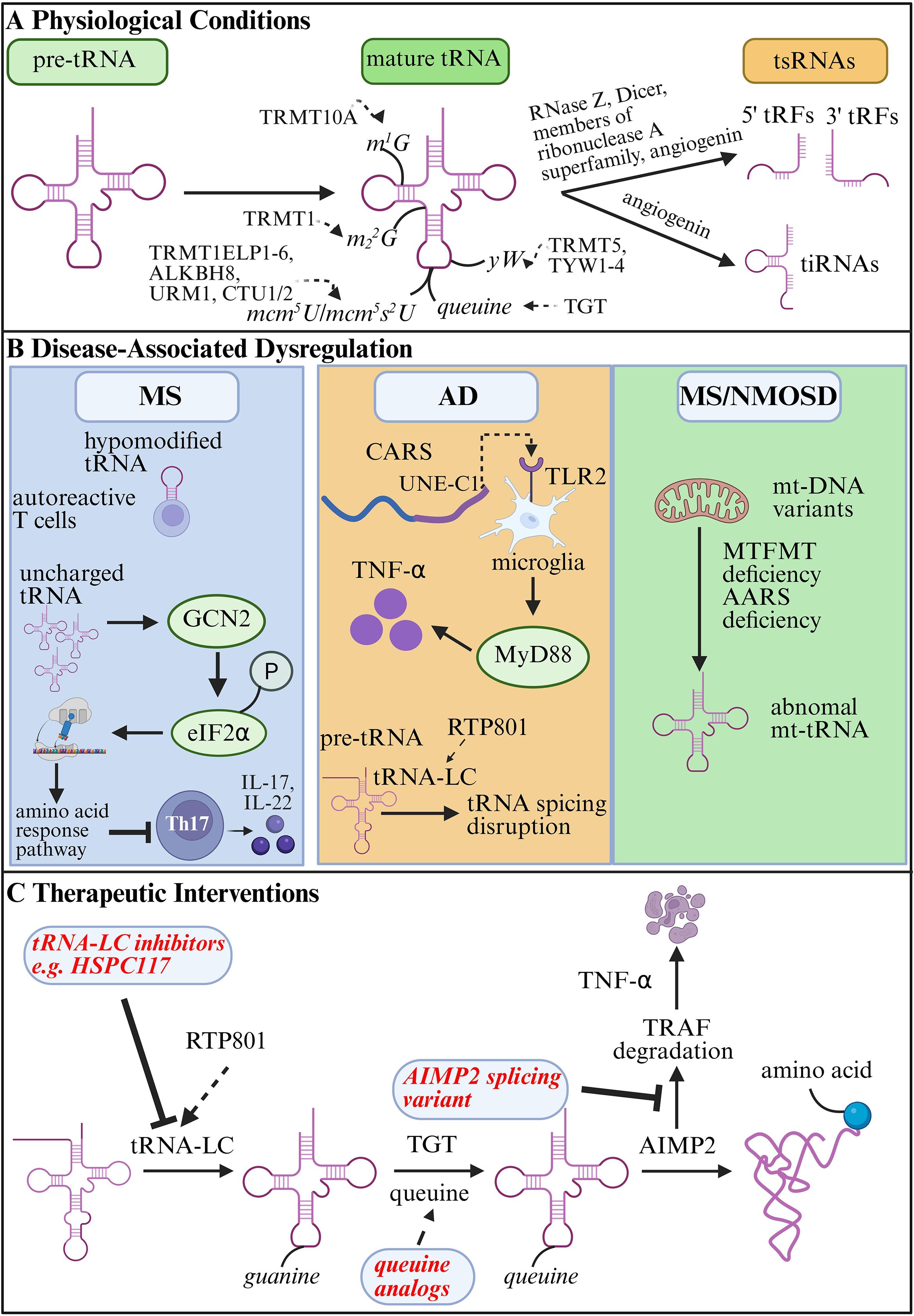 Figure 1. tRNA dynamics in neuroimmune homeostasis and dysregulation. (A) Physiological Conditions: Illustration of tRNA modifications (e.g., queuine modification) and fragmentation into tsRNAs under homeostatic conditions, contributing to immune tolerance and neuronal health. (B) Dysregulation in Neuroimmune Disorders: Hypomodified tRNA in autoreactive T cells and uncharged tRNA inhibiting the differentiation of Th17 cells (e.g., in MS); non-classical mechanisms of CARS and aberrant tRNA splicing (e.g., in AD); mt-tRNA variants and mutations in related enzymes mimicking demyelination (e.g., in NMOSD and MS). (C) Therapeutic Interventions: Potential therapeutic strategies targeting tRNA-related pathways, including queuine analogs, tRNA-LC inhibitors, and splice variants of AIMP2. tRNA, transfer RNA; pre-tRNA, precursor molecule; tsRNAs, tRNA-derived small RNAs; tRFs, tRNA-derived RNA fragments; tiRNAs, tRNA halves/stress-induced tRNA-derived RNAs; TGT, tRNA-guanine transglycosylase; yW, wybutosine; TRMT5, tRNA methyltransferase 5; TYW1-4, tRNA wybutosine-synthesizing enzyme 1-4; mcm5U, 5-methoxycarbonylmethyluridine; mcm5s2U, 5-methoxycarbonylmethyl-2-thiouridine; ELP1-6, the Elongator complex; ALKBH8, AlkB homolog 8 tRNA methyltransferase; URM1, ubiquitin-related modifier 1; CTU1/2, cytosolic thiouridylase subunit 1/2; m1G, 1-methylguanosine; TRMT10A, tRNA methyltransferase 10A; m22G, N2N2-dimethylguanosine; TRMT1, tRNA methyltransferase 1; MS, multiple sclerosis; GCN2, general control nonderepressible 2; eIF2α, eukaryotic translation initiation factor 2α; Th17, T helper 17 cells; IL-17, Interleukin-17; AD, Alzheimer’s disease; CARS, cytoplasmic cysteinyl-tRNA synthetase; UNE-C1, unique N-terminal extension C1 domain; TLR2, Toll-like receptor 2; MyD88, myeloid differentiation primary response 88; TNF-α, tumor necrosis factor-alpha; RTP801/REDD1, regulated in development and DNA damage responses 1; tRNA-LC, tRNA ligase complex; NMOSD, neuromyelitis optica spectrum disorder; mt-tRNA, mitochondrial tRNA; MTFMT, methionyl-tRNA formyltransferase; AARS, aspartyl-tRNA synthetase; HSPC117, an antagonist of tRNA-LC components; AIMP2, aminoacyl-tRNA synthetase-interacting multifunctional protein 2; TRAF, tumor necrosis factor receptor-associated factor.