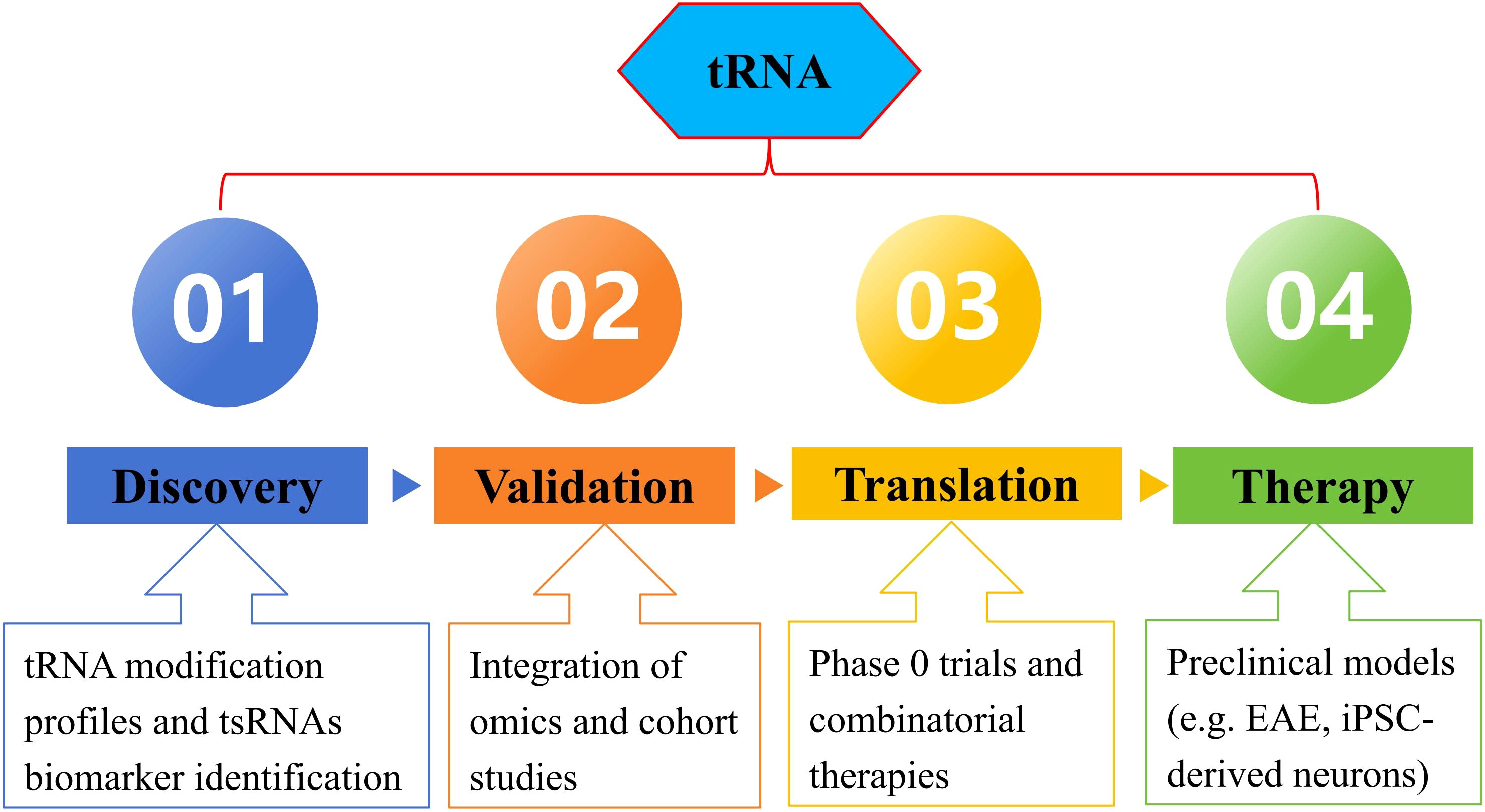 To fully harness tRNA biology for neuroimmune precision medicine, interdisciplinary efforts must address unresolved challenges (1): Gut-Brain-tRNA Axis: Deciphering how microbiome-derived metabolites like queuine shape CNS immunity could unlock dietary or probiotic interventions (42, 44) (2). Single-Cell tRNAomics: Resolving cell-type-specific tRNA modification landscapes will clarify their roles in microglial activation, OL differentiation, and neuronal vulnerability (13, 79) (3). Clinical Translation: Biomarker validation pipelines and phased clinical trials, guided by patient-derived iPSC models, are critical to transition tRNA-based therapies from bench to bedside.