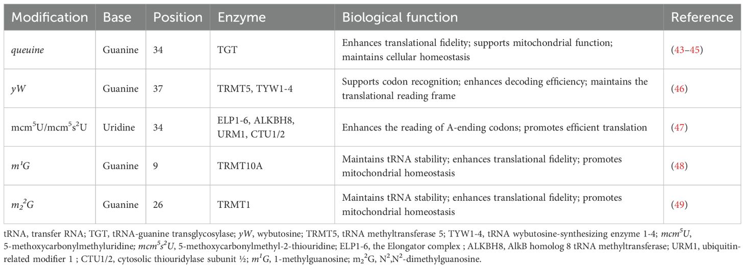 In humans, tRNA exhibit more than 40 distinct types of chemical modifications, which occur at specific nucleotide positions, such as queuine, wybutosine (yW), 5-methoxycarbonylmethyluridine (mcm5U)/5-methoxycarbonylmethyl-2-thiouridine (mcm5s2U), N1-methylguanosine (m1G) and N2,N2-dimethylguanosine (m22G) (Figure 1A). Queuine is a hypermodified 7-deazaguanine nucleobase incorporated post-transcriptionally at the wobble position of certain tRNA (42). Queuine modification of tRNA occurs via a unique base-for-base exchange reaction catalyzed by eukaryotic tRNA-guanine transglycosylase (TGT), replacing guanine with queuine in the tRNA anticodon loop (43). Functionally, this modification enhances translational fidelity, supports mitochondrial function, and maintains cellular homeostasis (44, 45). tRNA methyltransferase 5 (TRMT5) and tRNA wybutosine-synthesizing enzyme 1-4 (TYW1-4) catalyze the formation of a yW-modified tRNA at nucleotide position 37, which supports codon recognition, enhances decoding efficiency, and maintains the translational reading frame (46). The formation of the mcm5s2U modification is achieved through a multistep enzymatic pathway: the Elongator complex (ELP1-6) first adds a carboxymethyl group to the uridine at position 34, producing cm5U. Subsequently, AlkB homolog 8 tRNA methyltransferase (ALKBH8) catalyzes the addition of a methoxycarbonyl group to cm5U, yielding mcm5U. Finally, ubiquitin-related modifier 1 (URM1) together with cytosolic thiouridylase subunit 1/2 (CTU1/2) transfers sulfur to the C2 position of uridine, generating s2U, which ultimately combines to form the mature mcm5s2U modification, promoting the reading of A-ending codons and efficient translation (47). tRNA guanine methylations (m1G and m22G), catalyzed by TRMT10A and TRMT1, maintain tRNA stability, enhance translational fidelity, and promote mitochondrial homeostasis (48, 49) (Table 1). The functional significance of these modifications is underscored by the identification of more than 50 tRNA-modifying enzymes, mutations in which have been implicated in a variety of pathological conditions (50). Aberrations in tRNA modification processes are associated with neurodevelopmental disorders, cancer, diabetes, and mitochondrial dysfunction (51, 52).