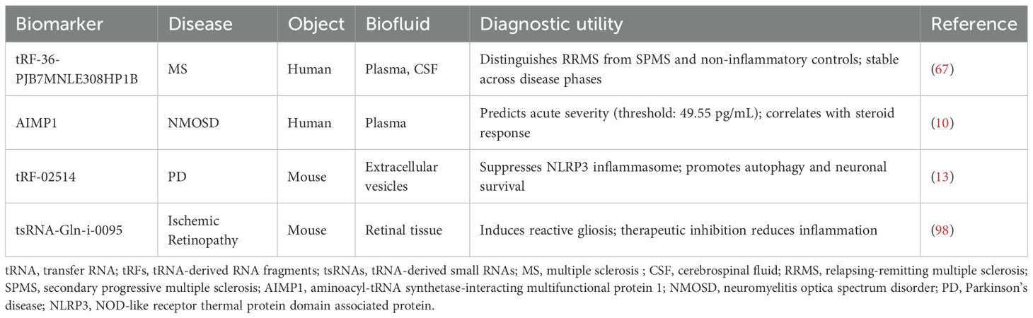 Liquid biopsy has emerged as a transformative tool for non-invasive disease monitoring, particularly in neuroimmune disorders. tsRNAs, including tRFs and tiRNAs, are stable in biofluids such as plasma and CSF, making them ideal candidates for biomarker discovery. For instance, in MS, tRF-36-PJB7MNLE308HP1B is upregulated in RRMS patients and distinguishes MS subtypes from other neurological conditions, suggesting its utility in early diagnosis (67). Unlike traditional inflammatory markers, tsRNAs signatures remain stable across disease phases, offering MS-specific diagnostic potential. However, their inability to reflect dynamic inflammatory changes limits their use in tracking progression. AIMP1 may serve as a potential severity biomarker in AQP4-IgG+ NMOSD. Its plasma levels correlate with disease activity and decline after corticosteroid therapy, indicating a dual role in diagnosis and treatment response (10).