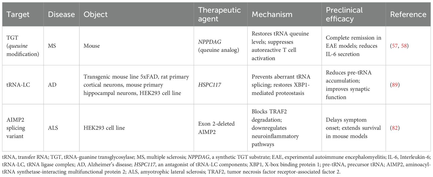 Precision targeting of tRNA-modifying enzymes exemplifies the translational potential of tRNA-centric strategies. Queuine analogs restore tRNA queuine levels in autoreactive T cells, suppressing neuroinflammation in preclinical MS models (10, 57). Similarly, antagonizing aberrant tRNA splicing via tRNA ligase complex inhibitors (e.g., targeting RTP801 in AD) could alleviate proteotoxic stress and inflammasome activation (89). Challenges remain in optimizing blood-brain barrier penetration and minimizing off-target effects, yet advances in nanoparticle delivery and prodrug design hold promise for enhancing therapeutic specificity.