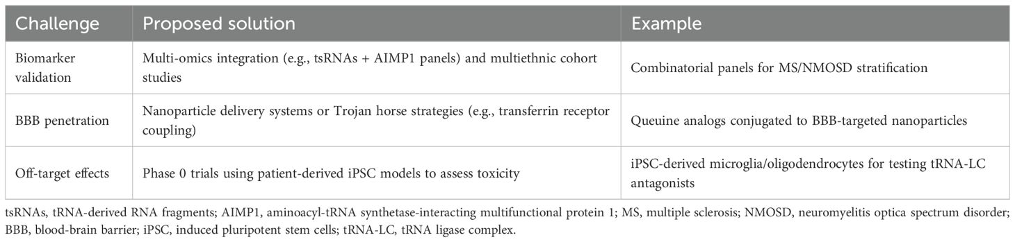 Despite promising preclinical data, tRNA-centric diagnostics and therapeutics face significant hurdles (1): Biomarker Validation: Plasma tsRNAs (e.g., tRF-36-PJB7MNLE308HP1B in MS) and AIMP1 in NMOSD require standardization across platforms and validation in diverse, multiethnic cohorts to avoid confounding factors like age, sex, or comorbidities (10, 67) (2). Drug Delivery: queuine analogs or tRNA-LC antagonists must achieve CNS penetration without off-target effects. Nanoparticle delivery systems or Trojan horse strategies that exploit endogenous transport systems (e.g., transferrin receptor-mediated transcytosis across the blood-brain barrier) will be essential to mitigate these barriers and enhance specificity before clinical translation (122, 123) (3). Safety and Efficacy: Chronic modulation of tRNA modifications may disrupt global translation or mitochondrial function. Phase 0 trials using patient-derived induced pluripotent stem cells (iPSC) models could preclinically assess toxicity (Table 4).