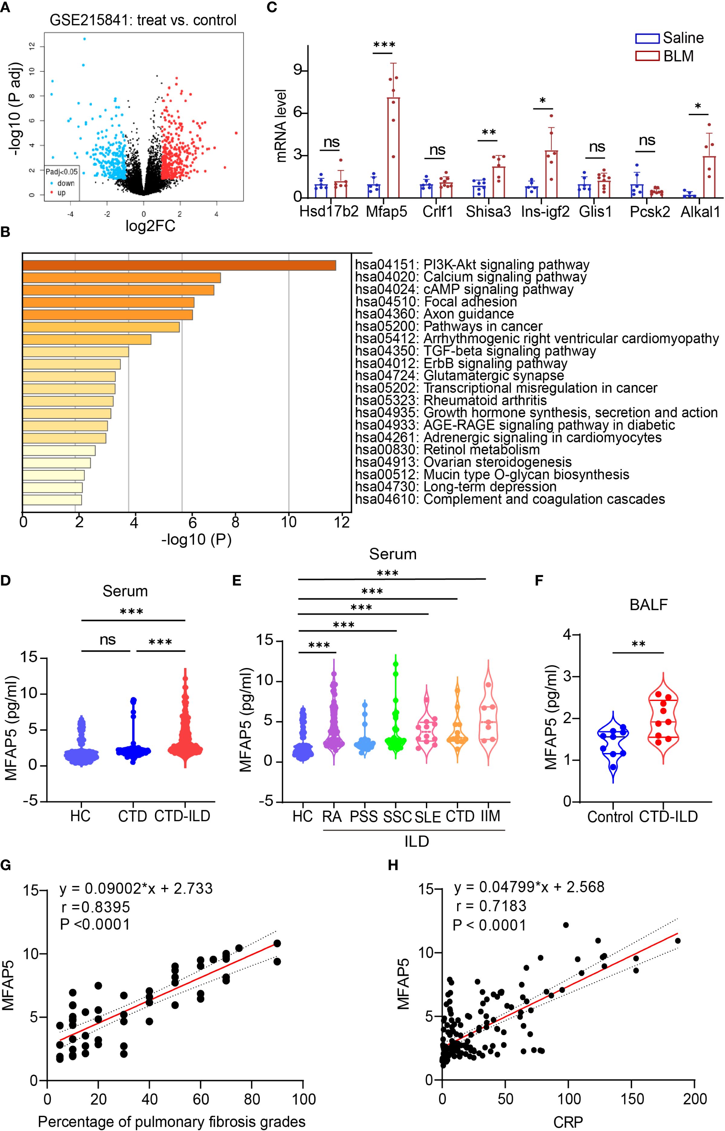 Figure 1. Identification and validation of differentially expressed genes. (A) Volcano plot showing gene expression levels in lung tissues of patients vs. healthy controls: colored dots represent DEGs, with red (upregulated), blue (downregulated), and gray (no change). (B) KEGG pathway enrichment analysis of DEGs. (C) qPCR validation of candidate genes in BLM-induced ILD vs. control mouse lungs (n=5-9 independent experiments). (D) ELISA quantification of serum MFAP5 levels in HC, CTD, and CTD-ILD patients. (E) MFAP5 expression differences across CTD-ILD subtypes and HC. (F) ELISA detection of MFAP5 in BALF of pulmonary infection patients with or without CTD-ILD. (G) Correlation analysis between MFAP5 and CTD-ILD pulmonary involvement severity. (H) Correlation between MFAP5 and serum CRP in CTD-ILD patients. Data are presented as mean ± standard deviation. ns, not significant; *P < 0.05, **P < 0.01, ***P < 0.001.