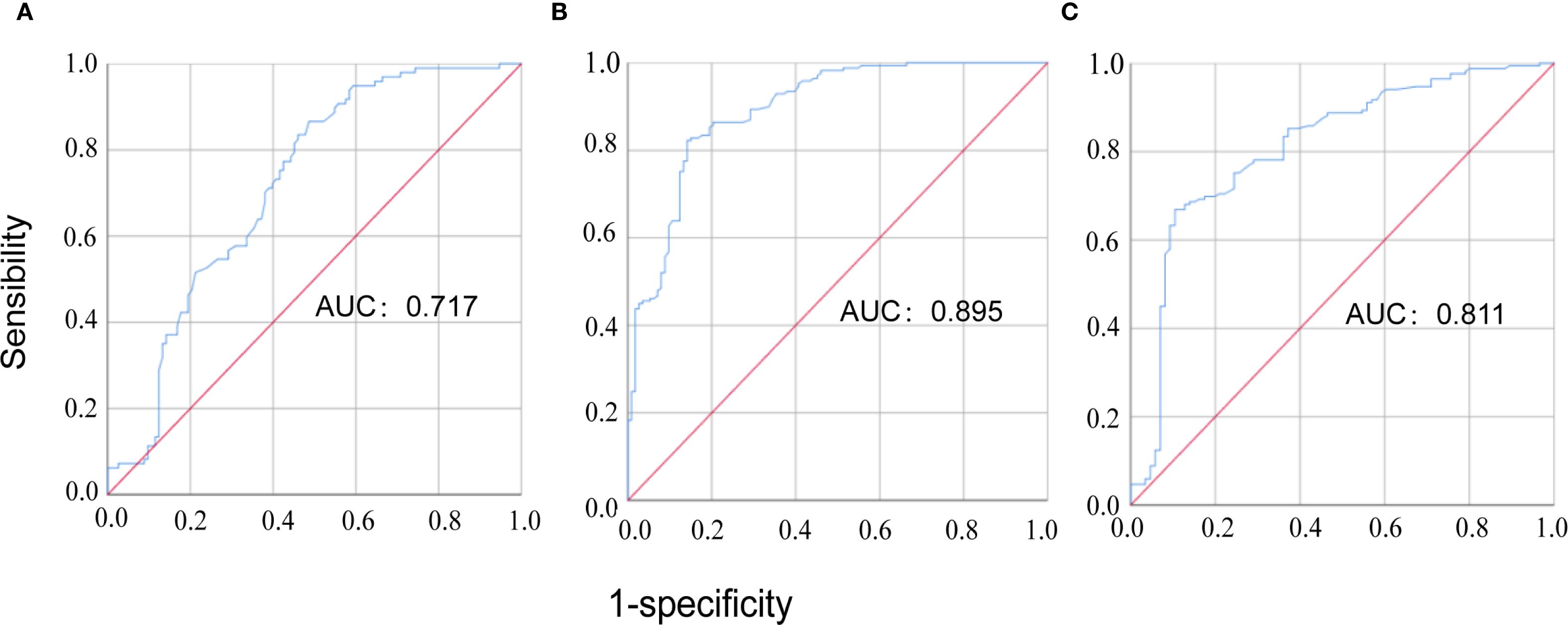 Figure 2. The ROC curve analysis of MFAP5 for discriminating CTD patients. (A) comparison between CTD-non-ILD patients and healthy controls; (B) comparison between CTD-ILD patients and healthy controls; (C) comparison between CTD-ILD patients and CTD-non-ILD patients.