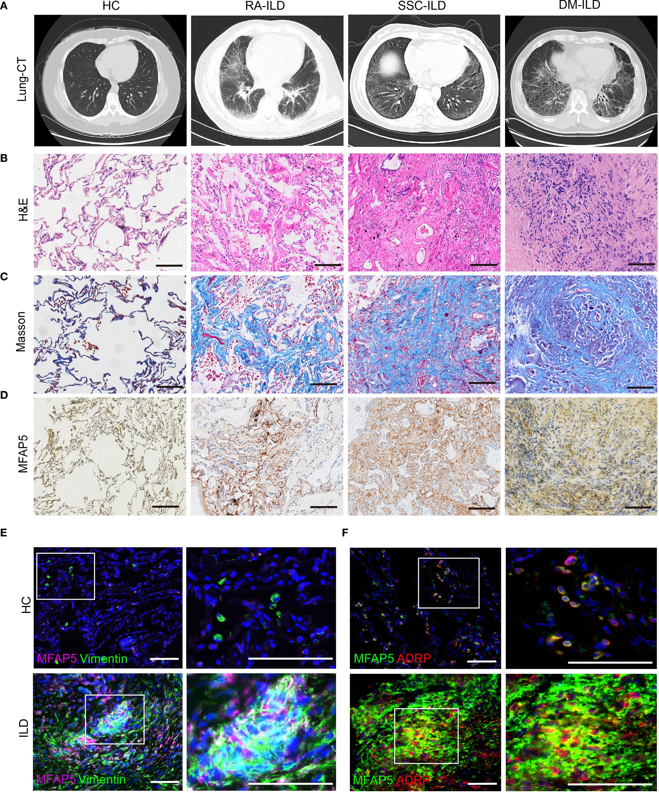 Figure 3. MFAP5 expression is elevated in the lungs of CTD-ILD patients. (A) ILD was confirmed via chest CT. (B) Lung biopsies from ILD patients underwent H&E staining, (C) Masson trichrome staining to assess collagen deposition, (D) and immunohistochemistry to quantify MFAP5 expression, scale bars, 100 μm. (E) Immunofluorescence staining of lung tissues revealed co-expression of MFAP5 with fibroblasts: green (Vimentin), pink (MFAP5), blue (DAPI). (F) Co-localization with adipose fibroblast subsets was observed: green (MFAP5), red (ADRP), blue (DAPI); scale bars, 50 μm.