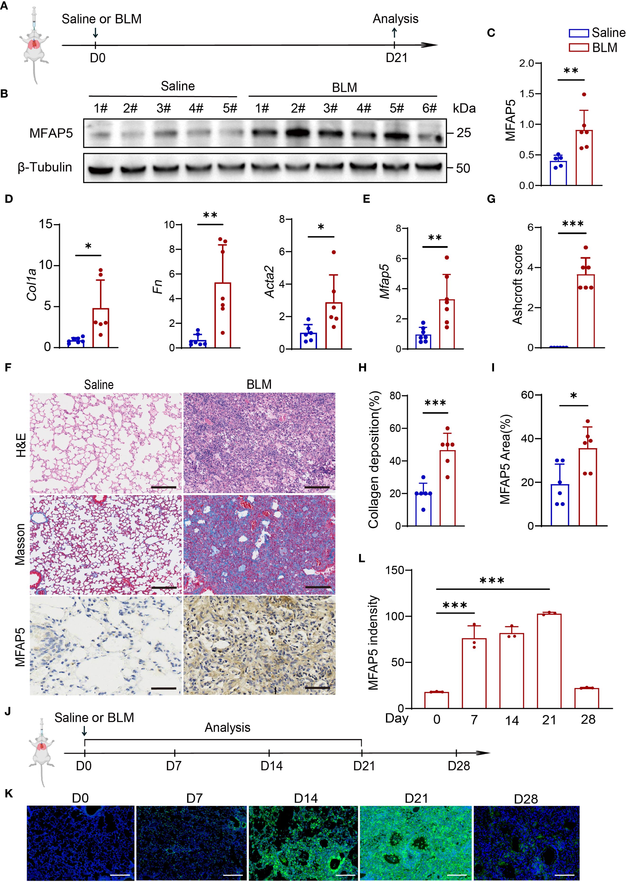 Figure 4. MFAP5 is upregulated in BLM-induced ILD model. (A) Schematic diagram of BLM-induced ILD. (B) Western blot analysis of MFAP5 protein expression in normal and BLM-ILD mouse lungs (n=5-6 independent experiments). (C) Quantification of band intensities. (D) qPCR analysis of Fn, Col1a, and Acta2 mRNA levels in BLM-ILD and control lungs (n=6-7 independent experiments). (E) Mfap5 mRNA expression in BLM-ILD vs. control groups. (F) H&E, Masson trichrome, and MFAP5 immunohistochemistry staining of lung sections from BLM-ILD and control mice. (G) Ashcroft scoring for ILD severity assessment. (H) Quantification of collagen deposition area. (I) Quantification of MFAP5 immunoreactivity. (J) Experimental timeline for lung tissue collection at different time points post-BLM instillation. (K) Immunofluorescence analysis of dynamic MFAP5 expression in BLM-ILD lungs: green (MFAP5), blue (DAPI). (L) Quantification of MFAP5 fluorescence intensity (n=3 independent experiments), (scale bars: 100 μm). Data are presented as mean ± standard error (n = 6 independent experiments). *p < 0.05; **p < 0.01; ***p < 0.001.