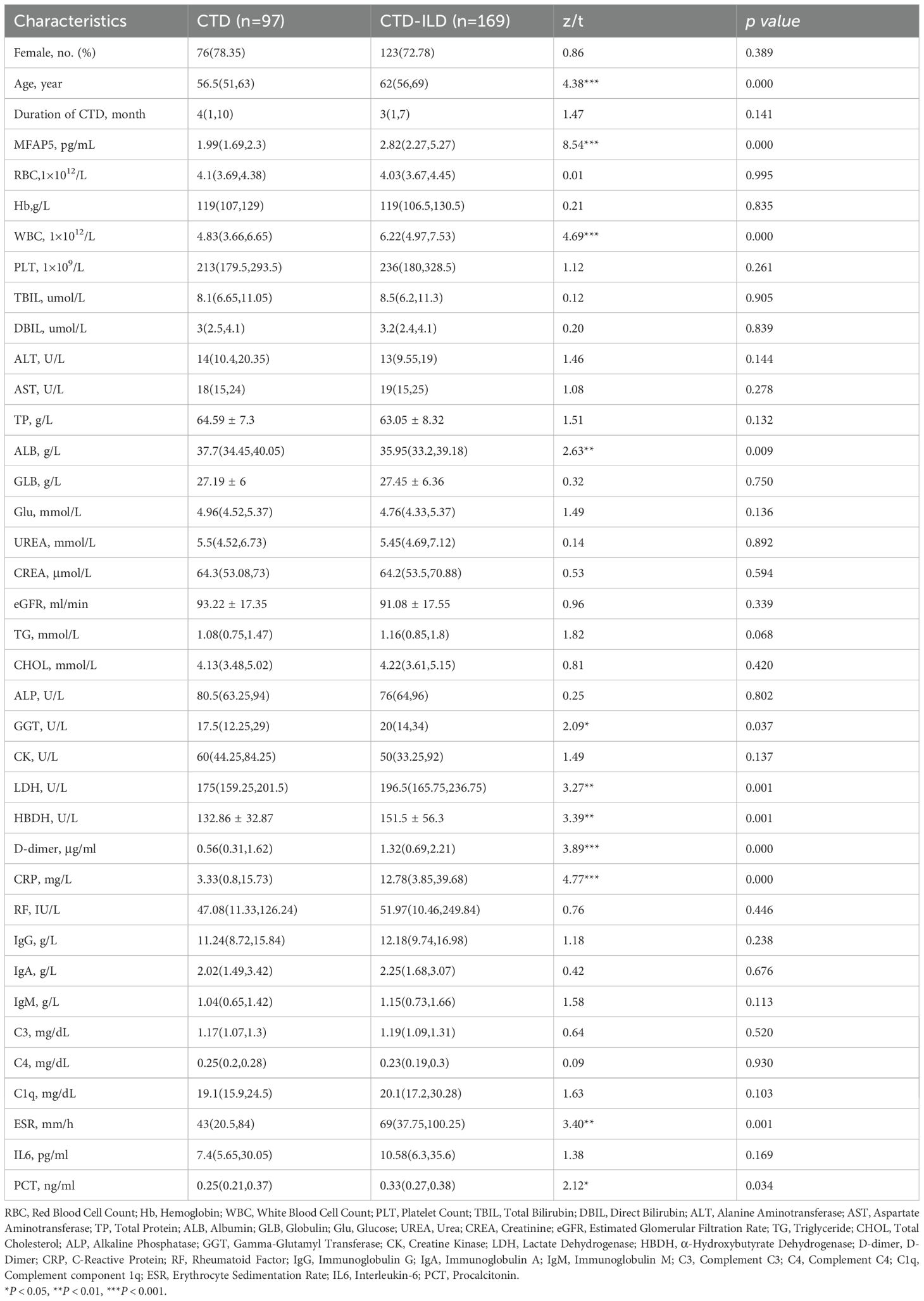 The study included 97 CTD patients, 169 CTD-ILD patients (sub-grouped as 82 RA-ILD, 20 PSS-ILD, 35 SSc-ILD, 12 SLE-ILD, 12 undifferentiated CTD-ILD, and 7 idiopathic inflammatory myopathy-ILD (IIM-ILD), Additionally, BALF samples were collected from 18 patients with pulmonary infection, 9 of whom had concurrent CTD-ILD. Demographics were balanced across groups: median age (interquartile range) was 62 (56,69) years for CTD, 56.5 (51,63) years for CTD-ILD, and 53 (46,61) years for HC. Statistical analysis showed no significant differences in median age or sex distribution (female proportion, P > 0.05). between CTD and HC groups, confirming demographic comparability (Table 1). Serum MFAP5 levels were significantly higher in CTD-ILD patients [2.82 (2.27, 5.27) pg/mL] than in CTD patients without ILD [1.99 (1.69, 2.30) pg/mL] (P<0.001), which, in turn, were markedly elevated compared with healthy controls [1.52 (1.025, 2.05) pg/mL] (P<0.001) (Figure 1D). No significant difference in MFAP5 expression was observed across CTD-ILD subtypes (Figure 1E). CTD-ILD patients exhibited significantly higher levels of Age, MFAP5, WBC, ALB, LDH, HBDH, D-dimer, CRP, ESR, and PCT compared to CTD-non-ILD patients (P < 0.05). with significantly higher expression in BALF of CTD-ILD patients with pulmonary infection (Figure 1F). MFAP5 positively correlated with degree of ILD involvement (Figure 1G) and serum CRP (Figure 1H).