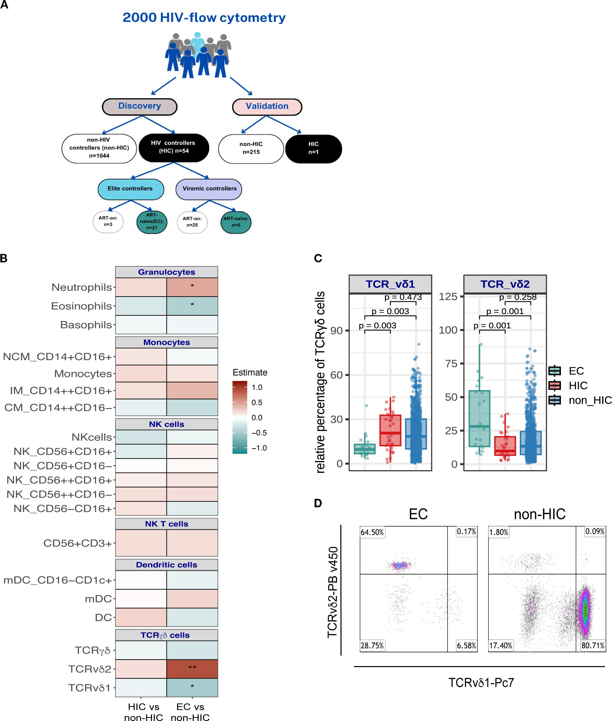 Figure 1. (A) Overview of the flow cytometry analysis in the 2000HIV cohort. The circulating immune cell phenotype was evaluated in 1,314 participants from the 2000HIV cohort to investigate the immunophenotype associated with HIV controllers (HIC), and elite controllers (EC). (B) Association analyses between the frequencies of innate cells and HIC (HIC), and ART naïve EC group (EC). Comparisons were performed between HIC vs. non-HIC and EC vs. non-HIC groups using a linear regression model adjusted for age, sex-birth, time to lab, seasonality, and COVID-19 vaccination status. Heatmaps display estimates from the linear regression model, with significant associations indicated (*p < 0.05, **p < 0.0001). (C) Comparison of the frequencies of TCRγδ1 and TCRγδ2 cells between EC (n=21), HIC (excluding ART-naïve EC, n=33) and non- HIC (n=1044). Comparisons were made using the Wilcoxon test and adjusted p values are displaying in the boxplots. (D) Representative flow cytometry dot plots from one EC, and one non-HIC participant illustrating the percentages of TCRγδ1 and TCRγδ2 cells relative to the parent gate (γδ T cells).