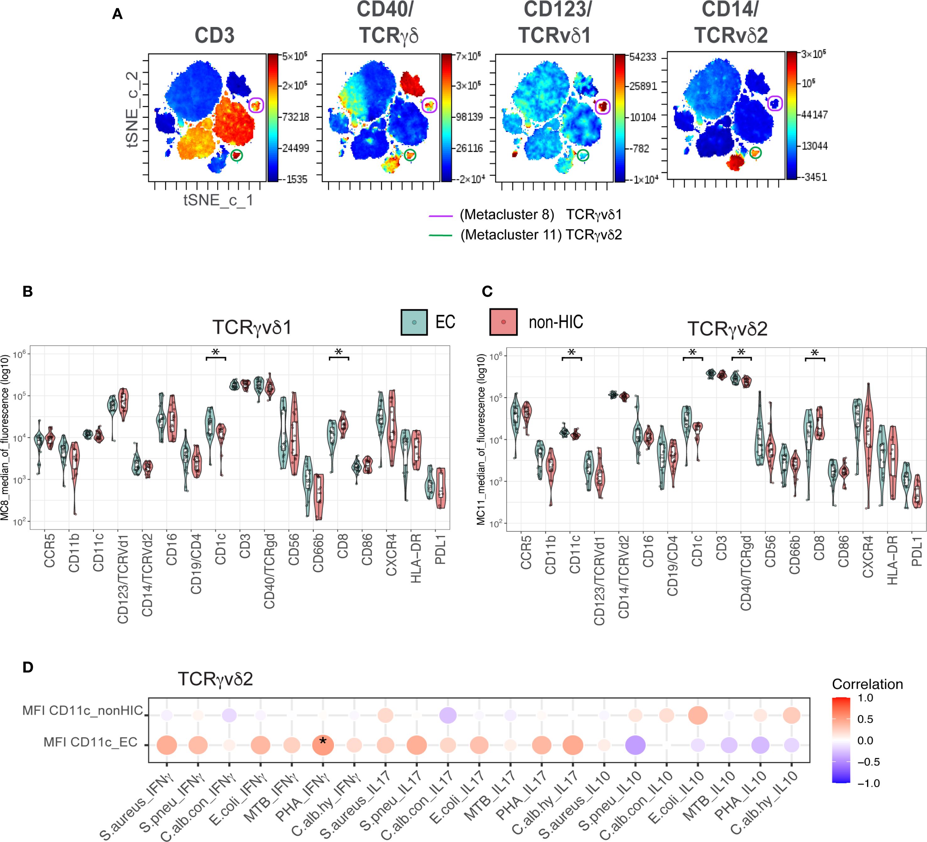Next, we compared the mean fluorescence intensity (MFI) levels of the markers included in the panel between non-HIC and EC in both TCRγδ metaclusters. As shown in Figures 2B, C, significantly lower CD8 expression levels and higher CD1c expression, a molecule involved in antigen presentation, were observed in both metaclusters from EC (adjusted p-value < 0.05). Additionally, in MC11, the TCRγδ2 metacluster from EC, higher levels of CD11c and TCRγδ receptor expression were detected (adjusted p-value < 0.05, Figure 2C). Unconventional TCRγδ T cells are known to upregulate CD11c in response to TCRγδ activation, which is associated with cytokines production (19). To investigate this, we analyzed the correlation between CD11c expression on TCRγδ2 and ex-vivo secretion of IFNγ, IL-17, and IL-10 by PBMCs upon stimulation with various stimuli. Although a significant positive correlation for IFNγ secretion upon PHA stimulation (p < 0.05) was found only in EC, the general correlation pattern emerging is that CD11c expression in EC shows a positive correlation with the secretion of proinflammatory cytokines IFNγ and IL-17, while a negative correlation was observed for the anti-inflammatory cytokine IL-10 (Figure 2D).