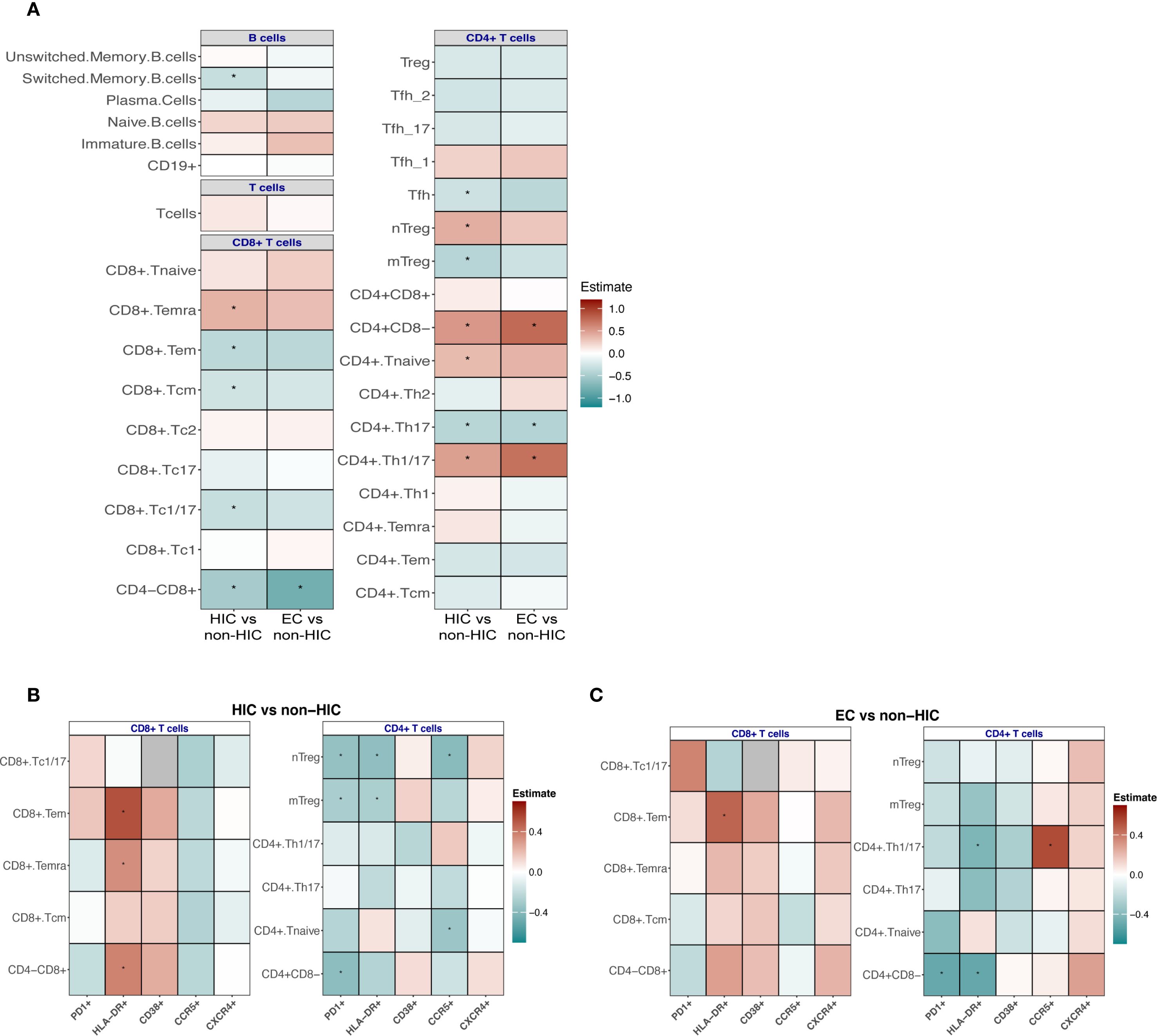 As with the innate compartment, the frequencies of adaptive immune cells were compared between HIC and non-HIC, as well as between EC and non-HIC (Figure 3). Significant differences were observed in the frequencies of various CD4+ and CD8+ T cell subsets in HIC compared to non-HIC (Figure 3A, left side of the heat map). Specifically, HIC exhibited higher frequencies of CD4+ (CD4+CD8-) T cells, CD4+ naïve T cells, CD4+ Th1/17 T cells, CD4+ naïve Treg, and CD8+TEMRA cells. Conversely, lower frequencies were observed for CD4+ Th17 T cells, CD4+ Tfh (T follicular helper) T cells, CD4+ mTreg, CD8+ T cells (CD4-CD8+), CD8+Tc1/17, CD8+ central memory T cells (Tcm) and CD8+ effector memory T cells (Tem) (Figure 3A, left side of the heat map).