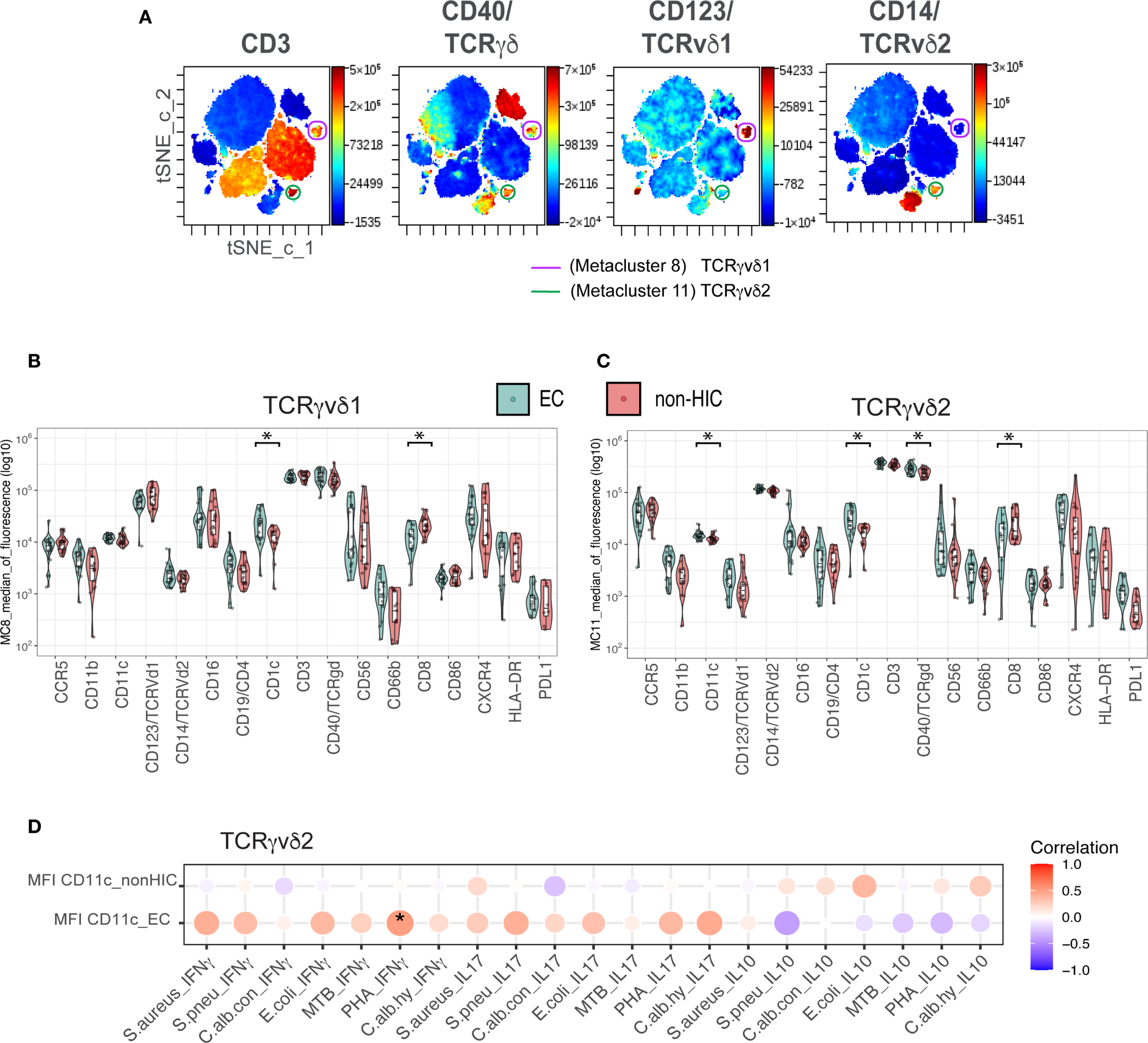 We assessed differences in the mean intensity of fluorescence (MFI) for phenotypic, activation and exhaustion markers between HIC vs non-HIC and EC vs non-HIC using Wilcoxon test (adjusted p-value <0.05).