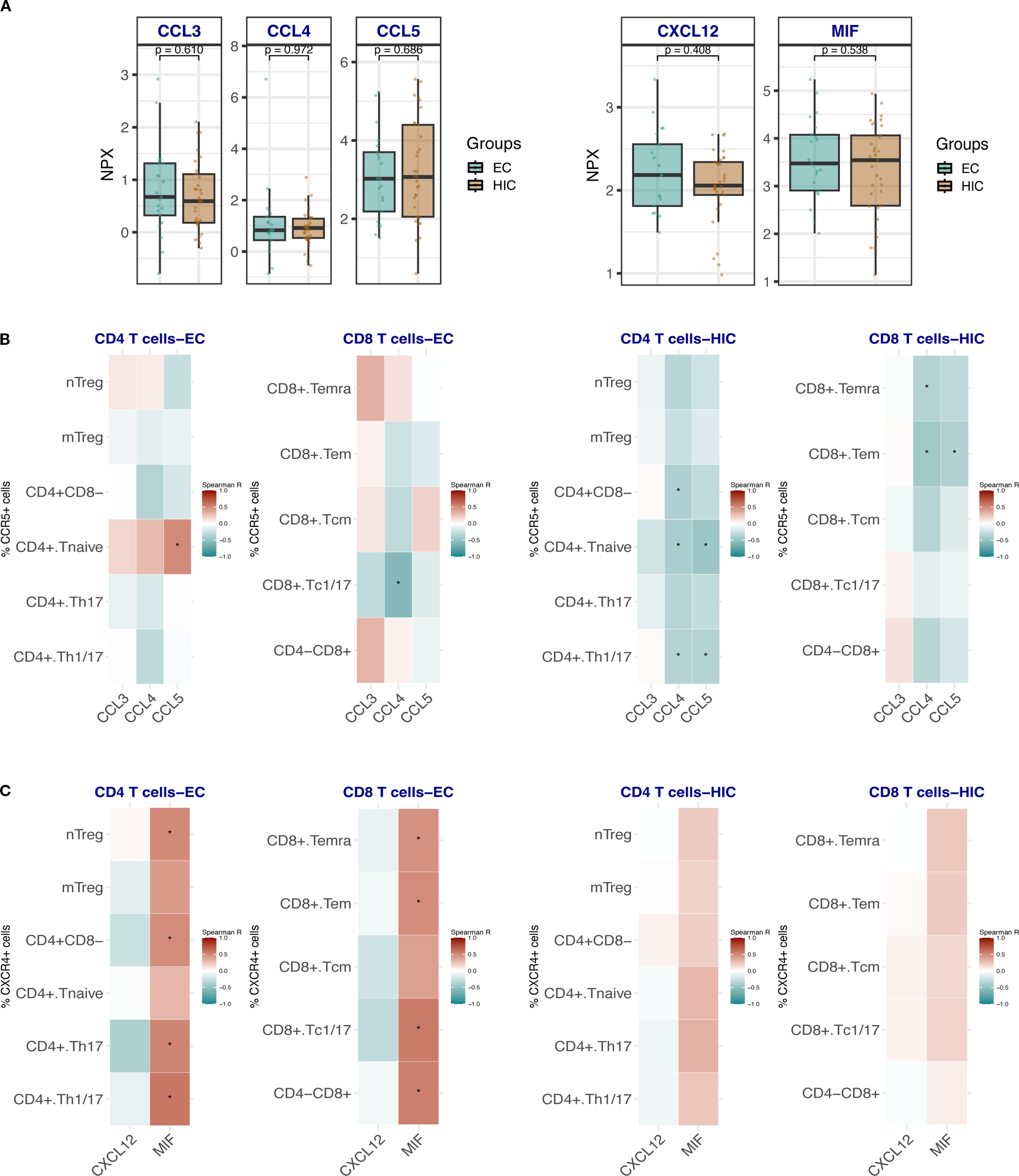 Plasma levels of the chemokine ligands CCL3, CCL4, CCL5, CXCL12, and MIF were quantified using a proximity extension assay (PEA) coupled with next-generation sequencing (NGS) as the detection method. Measurements were performed by Olink® Proteomics AB (Uppsala, Sweden) using the Olink® Explore 3072 platform, which enables high-throughput analysis of plasma proteins (18). Protein abundance is reported as Normalized Protein eXpression (NPX) values, a relative quantification unit provided by Olink that is presented on a log2 scale. These analytes were selected for their known role as ligands of CCR5 (CCL3, CCL4, CCL5) and CXCR4 (CXCL12, MIF). Correlation analyses were performed between plasma chemokine levels and the frequencies of CCR5+ or CXCR4+ CD4+ and CD8+ T cells using Spearman rank correlation.