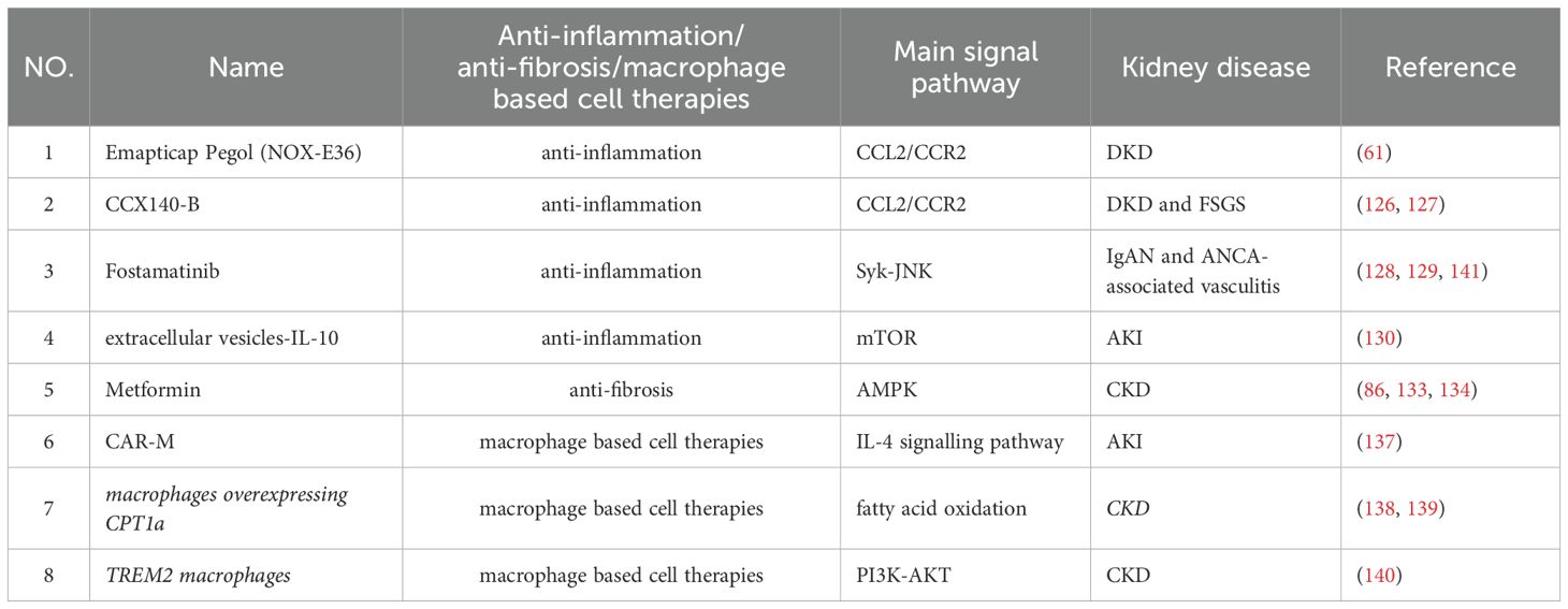 In summary, a substantial body of research has already focused on targeting kidney macrophages, aiming to modulate their polarization, phenotype, and function to achieve anti-inflammatory and anti-fibrotic effects, as well as to develop macrophage-based cell therapies, thereby attenuating disease progression.