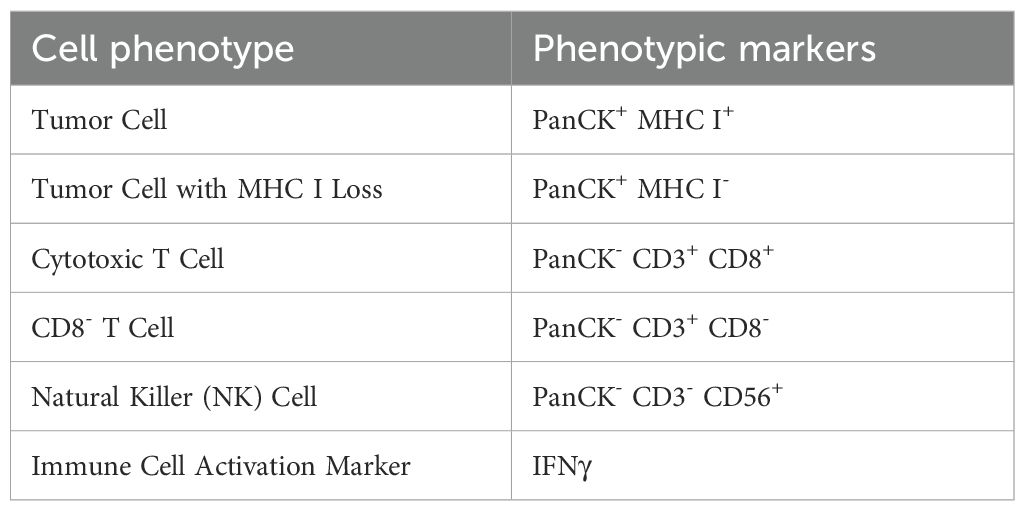 NSCLC patient tissues were analyzed as described in (35). Briefly, they were stained with antibodies against pan-cytokeratin (PanCK), the HC10 monoclonal antibody which is a pan- major histocompatibility complex class I (MHC I) antibody, staining the MHC class I (MHC I) alleles HLA-A, -B, and -C, CD3, CD8, CD56, interferon gamma (IFNγ), and DAPI. HALO (Quantitative Image Analysis for Pathology by Indica Labs) was used to segment individual cells and assign stain positivity. Combinatorial marker expression was used to classify cellular phenotypes (Table 2), and a classifier was trained to identify tumor and stroma regions based on PanCK positivity. Each cell was then assigned a specific phenotype and regional annotation for downstream analysis.