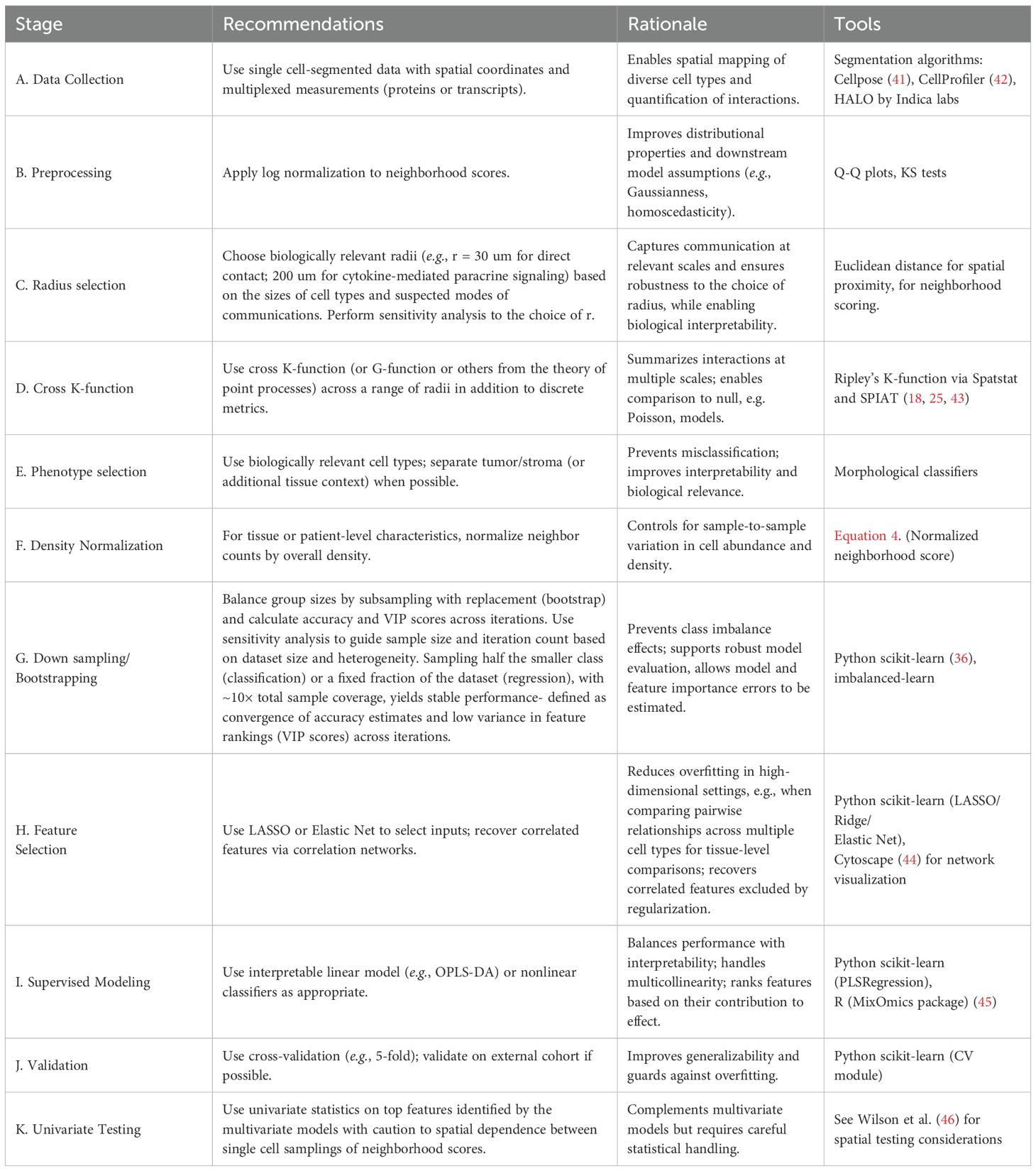 We compiled a table of best practices based on our experiences with spatial single cell-resolved multiplexed data such as multiplex immunofluorescence imaging (Table 3), which can be applied to other spatial proteomics and transcriptomics data. For each step, the table outlines specific recommendations, provides the rationale behind them, and lists implementable tools and packages. We hope this resource will serve as a resource for effectively managing and analyzing similar data and building upon.