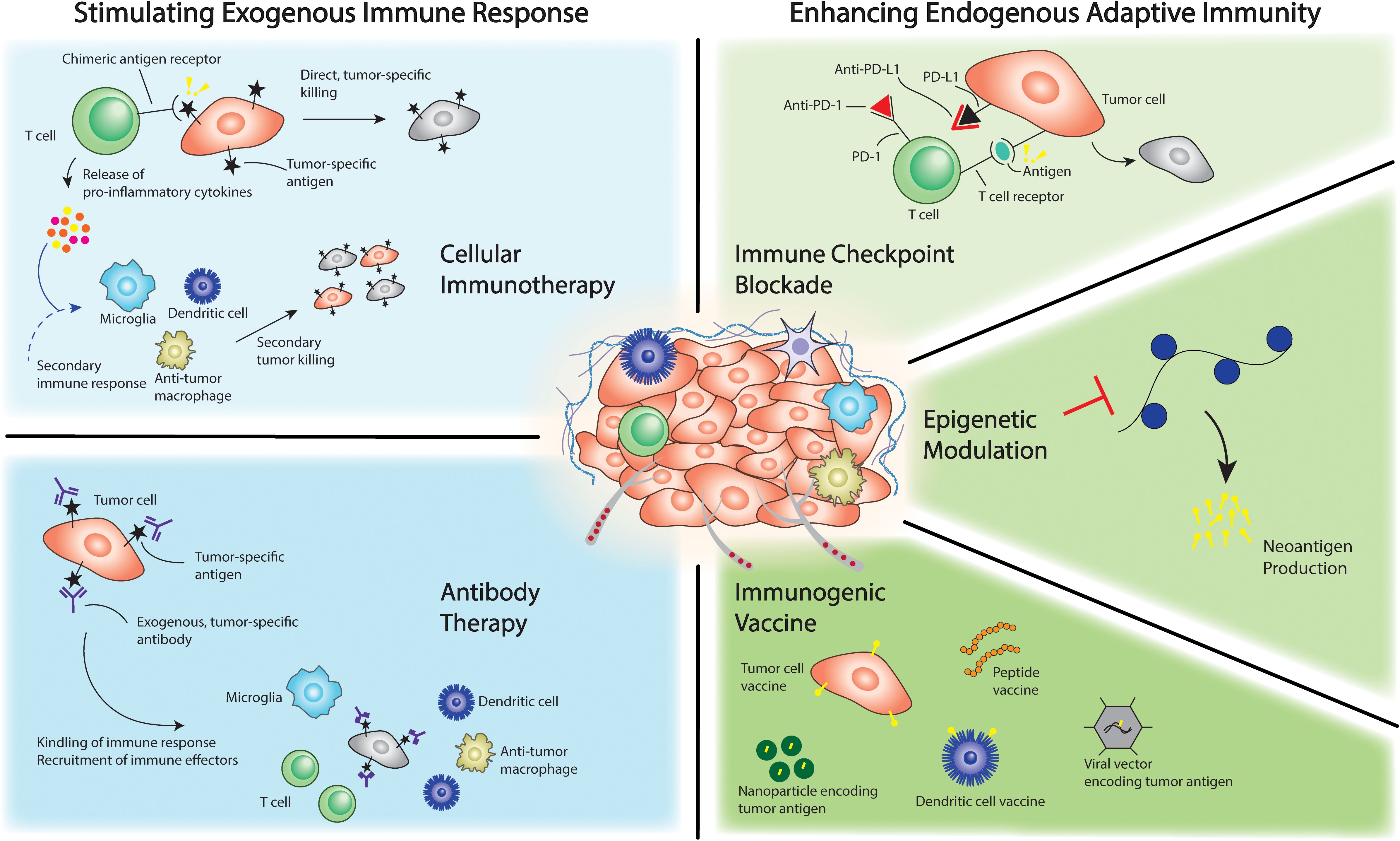 The advent of immunotherapy approaches in cancer and the success observed in the treatment of several blood and solid cancers in adults inspired an alternative therapeutic strategy in the treatment of pediatric brain tumors (3, 4). Immunotherapy strategies against brain tumors have continued to evolve over recent years as the understanding of the basic biology and tumorigenesis has improved and represents an area of intense ongoing research (4–6). Current strategies are largely centered around stimulating a patient’s immune system against tumor or the delivery of immune-based, cell therapy that is able to target the tumor (Figure 1) (3, 4, 7–9). Specifically, the former strategy aims to galvanize the adaptive immune system against tumor utilizing a number of approaches. These include immune checkpoint point inhibition and enrichment of neoantigens in the tumor milieu through epigenetic therapeutics or tumor vaccines (4, 7, 10). Alternatively, immune-based cell therapy most commonly involves engineering of T cells to express chimeric antigen receptor (CAR) targeted to tumor-associated antigens or other receptors enabling tumor-targeting. In this approach, groups have described local and peripheral delivery of the cell therapy to directly target tumor cells and simultaneously stimulate the adaptive immune system (3, 4, 7, 10, 11). The strategies summarized in Figure 1 are germane for preclinical modeling of the immune microenvironment because the ideal model would recapitulate key features that are necessary to evaluate and refine these strategies in a preclinical setting. For example, to adequately evaluate the efficacy of cellular immunotherapy approaches, the ideal preclinical model would necessarily utilize a strategy that accurately reconstitutes the immune cellular milieu of the tumor type in question (microglia, dendritic cells, macrophages). Similarly, T cells in addition to the aforementioned cell types would be incorporated into the ideal model when evaluating immune checkpoint blockade and antibody-based therapy approaches. Understanding the mechanism of current treatment strategies in this way can be important in selecting or developing the appropriate preclinical model for therapy evaluation as will be discussed in subsequent sections.