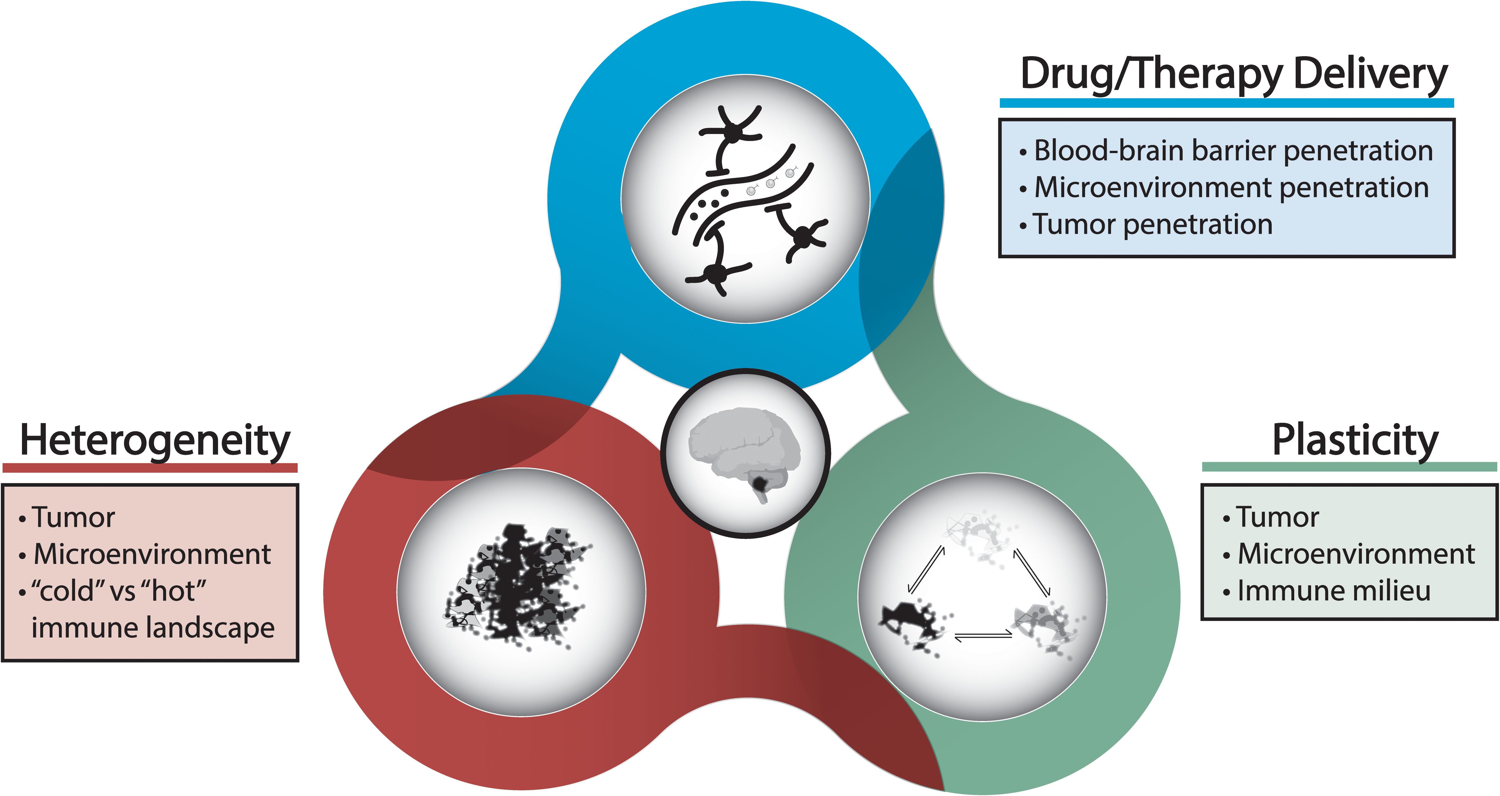 Current understanding of the basic biology of pediatric brain tumors, namely medulloblastoma and glioma, has evolved over the past decades beyond traditional histopathological classifications to include molecular and epigenetic characterization of tumor subtypes (3, 6, 9, 22–28). This work has led to the discovery of the concepts of tumor heterogeneity and tumor plasticity and evolution as it pertains to treatment (Figure 2). In the case, of the aforementioned immunotherapy approaches, tumor heterogeneity poses a significant challenge for targeted immunotherapy especially in the case of brain tumors that have been described to be immunologically “cold” or devoid of the immune milieu or cell surface antigens needed to kindle an anti-tumor immune response (21, 24–26, 28–31). As a result, effective immunotherapeutic agents are required to have robust targeting to a tumor-associated antigen or other tumor microenvironment target that is ubiquitous so that it is not affected by heterogenous tumor populations. Similarly, the ideal targeted immunotherapeutic should have the ability to overcome adaptation and plasticity inherent to many tumor cells where tumor cells may downregulate a specific antigen or alter their phenotype to evade immune response, i.e. immune escape or immune evasion strategies (4, 11, 16). In order to develop targeted immunotherapeutic agents or cellular therapies with effective targeting, a model system that accounts for tumor heterogeneity and plasticity as well as incorporates dynamic interactions between other immune cells in the tumor microenvironment is necessary for high-fidelity evaluation of novel therapeutics.