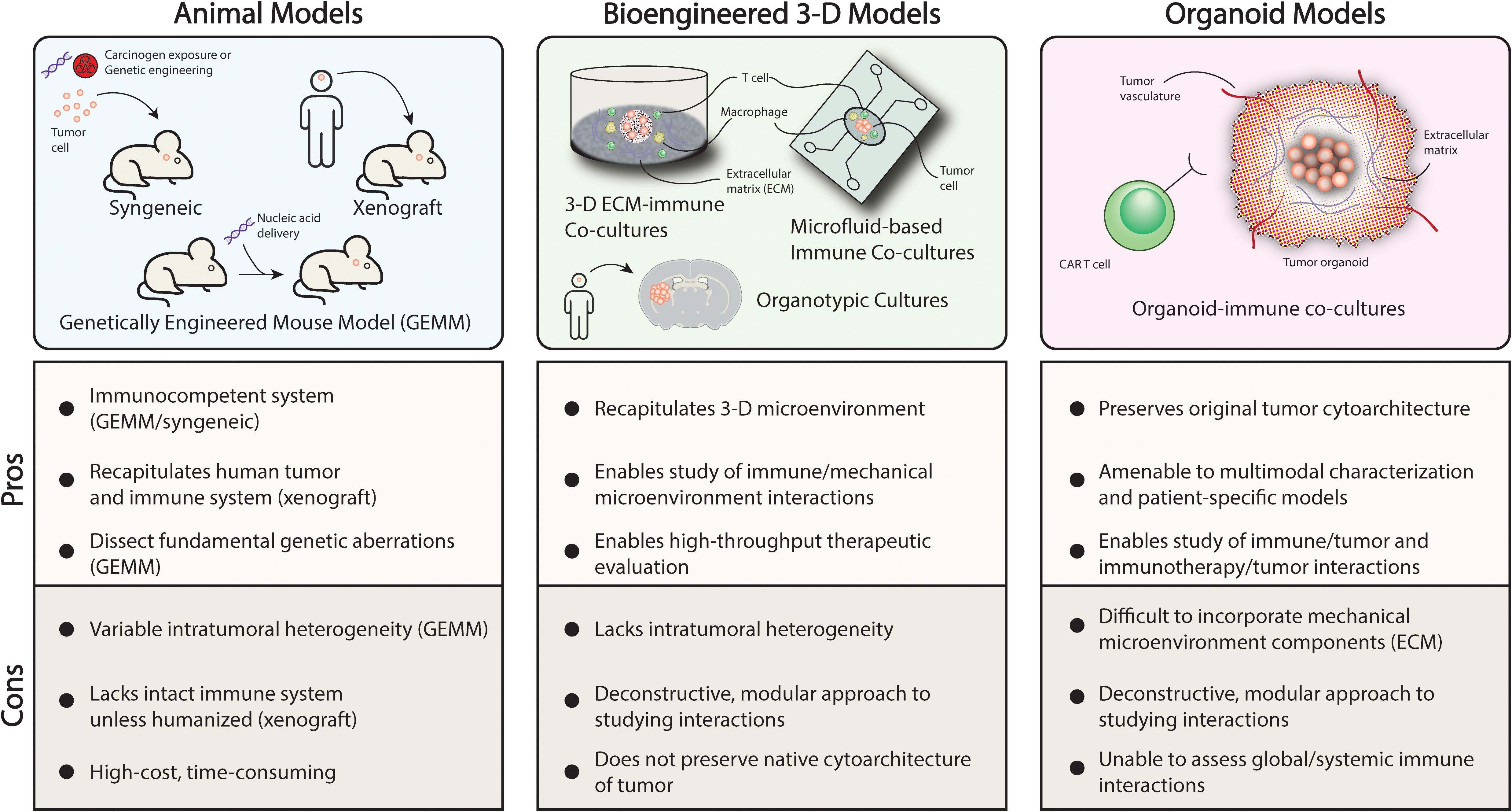 Effective and multimodal preclinical modeling can help to optimize immunotherapy development before clinical translation. The sophistication of modeling has tremendously increased over the past years enabling interrogation of immunotherapy-tumor cell or immunotherapy-microenvironment interactions that were not easily achieved in the past. Leverage of newer technologies including organoids and advanced animal models in combination represents an important opportunity to streamline the immunotherapy development pipeline and detect potential areas of therapy failure or treatment resistance prior to clinical translation.