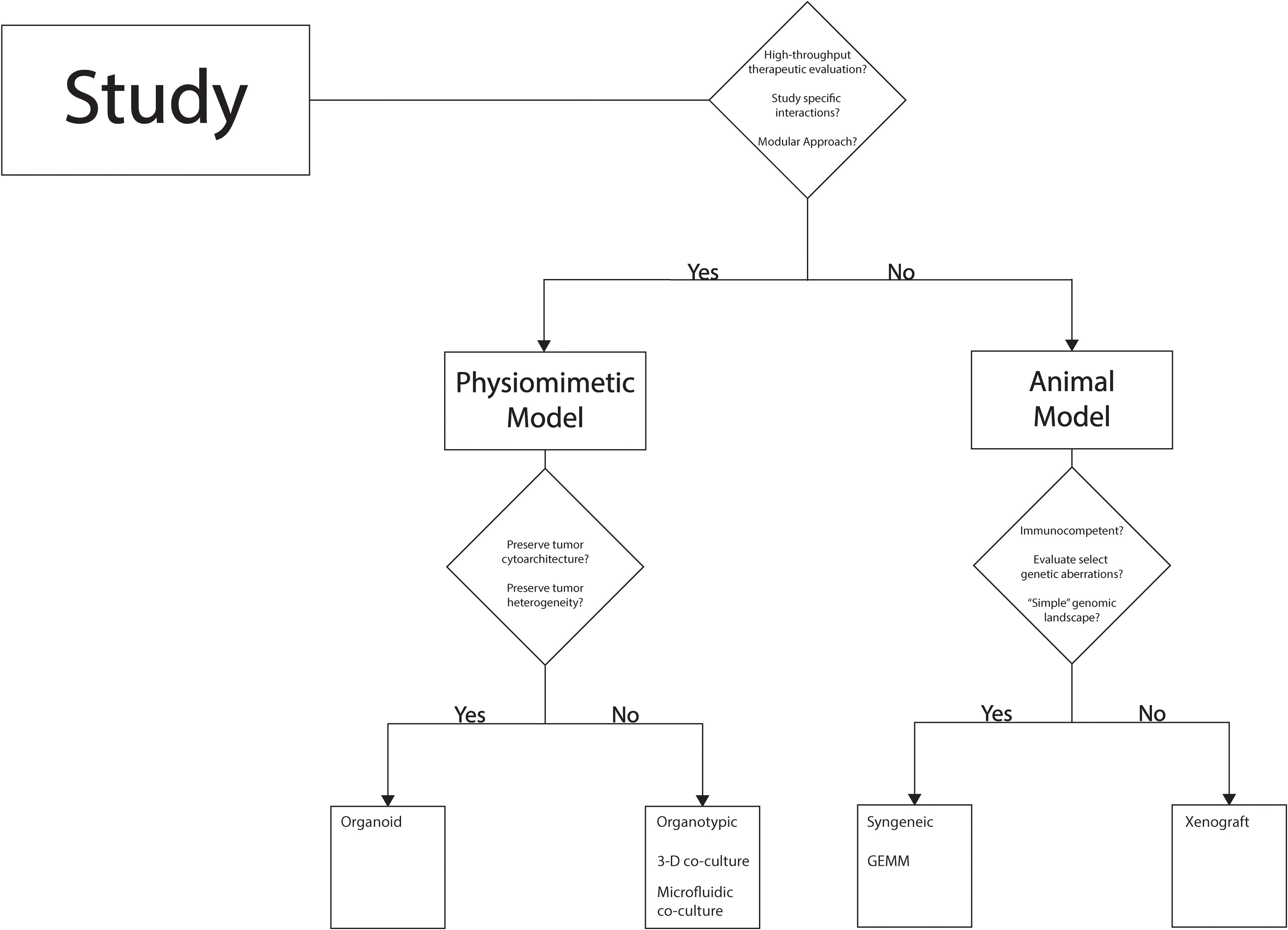 Though significant advances in preclinical modeling of pediatric brain tumors have been realized in recent years, there continues to be gaps in the features of the tumor microenvironment and the immune microenvironment currently. As a result, there is no individual modeling strategy that is capable of accounting for the complexity of brain tumors pertaining to therapy development, so a thoughtful approach needs to be adopted in selecting a modeling strategy to effectively answer the question at hand while considering tumor-specific nuances. Figure 4 offers one such framework to organize research questions and other considerations in selecting a modeling strategy. Certain strategies are particularly suited for exploratory studies within the context of pediatric neuro-oncology including high-throughput evaluation of therapeutic studies or studies looking to assess rudimentary efficacy based on a hypothesized therapeutic sensitivity or vulnerability. In such cases, in vitro studies utilizing readily available tumor cell lines is one option which is outside of the scope of the present review, but discussion of this strategy can be found elsewhere (10). A more sophisticated option in light of recent advances is the use of physiomimetic models including organoids as previously discussed. These models are much less time-consuming and labor intensive than animal models and are ripe for high-throughput study of therapeutics. Moreover, this category of models can be valuable in early mechanistic studies of tumor biology or therapeutic evaluation where a modular approach is used, and a single variable can be altered to interrogate a specific pathway or therapeutic sensitivity. For example, if the interaction of a tumor cell and a specific immune cell needs to be studied in the context of a therapy or a change in the mechanical microenvironment, an organoid model or organotypic model may be ideal. Conversely, if the research goal is to study the therapeutic efficacy of a well-characterized therapeutic strategy in anticipation of short-term clinical translation, animal models would be necessary to capture the complexity of the brain milieu and systemic immune system. Selection of the type of animal model can vary with the type of tumor being studied and whether the goal is to solely understand a feature of disease process or to also test a therapeutic agent, i.e. survival, adverse effects, etc. Certain tumor types such as DIPG that harbor clearly defined genetic or molecular events underlying tumorigenesis may be accurately modeled by strategies that can introduce these few aberrations efficiently (GEMM, syngeneic models) (4, 25, 43, 45, 57). Other tumor types such as glioblastoma or ependymoma tend to have a less “clean” genetic profile or series of critical events leading to tumorigenesis; in these cases, a xenograft model may be more feasible to capture the genomic and molecular complexity of the tumor and use alternative models when evaluating therapeutics (4, 23, 25, 80, 82–84). As technology and understanding of the basic biology of various pediatric brain tumors improve, a pipeline that incorporates multiple models may be feasible to leverage the strengths of each to investigate a mechanistic feature of the disease or a potential therapeutic in a streamline fashion.