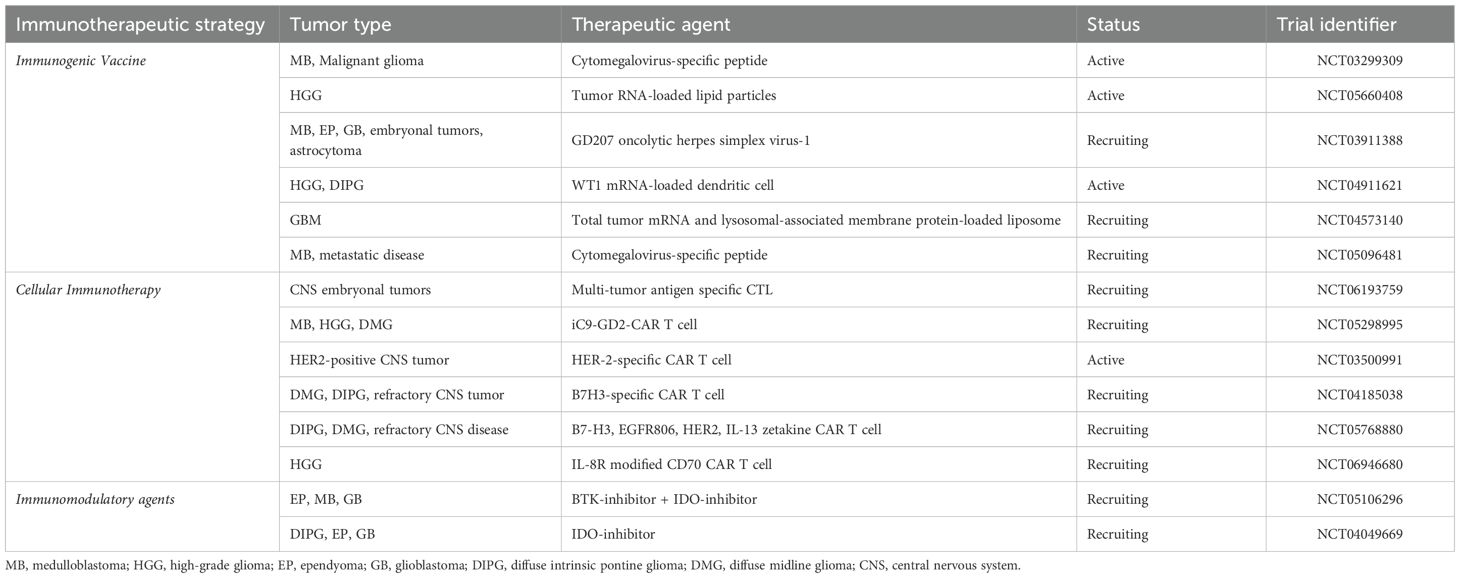 3. Hwang EI, Sayour EJ, Flores CT, Grant G, Wechsler-Reya R, Hoang-Minh LB, et al. The current landscape of immunotherapy for pediatric brain tumors. Nat Cancer. (2022) 3:11–24. doi: 10.1038/s43018-021-00319-0
