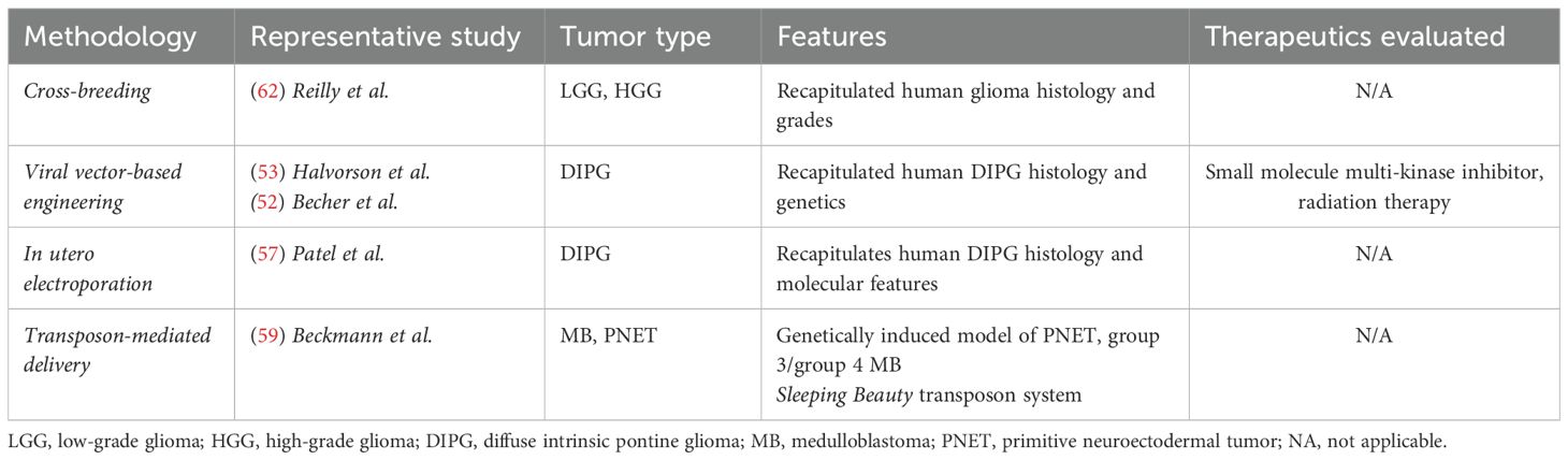 GEMMs comprise a distinct group of murine models that are particularly useful for studying the early steps in tumorigenesis as well as drug screening in pediatric brain tumors (10, 41). GEMMs can be created by identifying suspected key driver mutations that are essential for the oncogenesis of a particular type of tumor, and then engineering this genetic driver into mice (10, 46). There are a number of different methodologies used to engineer key mutations or knockouts into murine lines that include crossbreeding, viral vector-based engineering, in utero electroporation, or transposon-mediated delivery which are summarized in Table 2 (10, 47, 48). The traditional and most common method of engineering GEMMs has been through the use of the Cre-LoxP system which can be used to create conditional knockout mice; this system can also be designed to incorporate inducible hormone response elements that enable temporal control over the genetic events of interest (10, 46, 49). The RCAS/t-va is a prominent alternative to the traditional Cre-LoxP system that employs the replication-competent avian sarcoma-leukosis virus to deliver oncogenes of interest to somatic cells engineered to express the t-va receptor. This system has been used successfully to engineer both pediatric brainstem glioma and adult glioma models (50–53). In utero electroporation is a distinct methodology that has been used successfully by a number of groups to create pediatric brain tumor models (10, 46, 54–58). This methodology has been found to be particularly useful in generating tumors that are characteristically located in highly eloquent regions such as the brainstem, i.e. diffuse intrinsic pontine glioma. In this technique, embryos from pregnant mice are identified following laparotomy, and plasmid DNA of interest is injected into the desired region of the brain. The region of the brain is then stimulated with pulsed electroporation to facilitate DNA uptake (54–58). Transposon-based mutagenesis has also been employed by multiple groups; the Sleeping Beauty transposon system is the most widely used in brain tumor modeling and a detailed description of this technique can be found elsewhere (47, 48, 59–61). Briefly, this system enables insertional mutagenesis of genes of interest into specific tissues to produce different types of tumors. One advantage of this approach is that this system can be used to perform functional genomic screens whereby genetic alterations suspected to be fundamental to tumorigenesis of various tumor types can be introduced and subsequently assessed through in vitro and in vivo assays (47, 48, 59–61).In one of the earliest GEMMs, Reilly et al. create an Nf1, Trp53 compound heterozygote strain to create a range of astrocytomas driven by loss of Trp53 tumor suppressor function (62). Larson et al. apply a similar approach to diffuse intrinsic pontine gliomas by creating a mouse model with neonatal H3.3K27M, PDFRA activation, and Trp53 loss (63). They discover that together, these genetic alterations accelerate brainstem glioma formation signifying that these genes are implicated in the basic neurodevelopment of diffuse intrinsic pontine glioma (63). Pathania et al. created a similar model requiring only H3.3K27M and Trp53 loss with in utero electroporation and mutagenesis (56). Groups have used these models for successful testing of epigenetic immunotherapeutic agents and small molecule inhibitors (43, 64). Similar models have also been developed for subtypes of medulloblastoma allowing development of mutation-specific therapies (28, 31, 65). Despite the utility of GEMMs in study key genetic alterations and tumorigenesis, certain models are limited by inability to recapitulate the true intratumoral and locoregional heterogeneity observed in human pediatric brain tumors (10, 41).