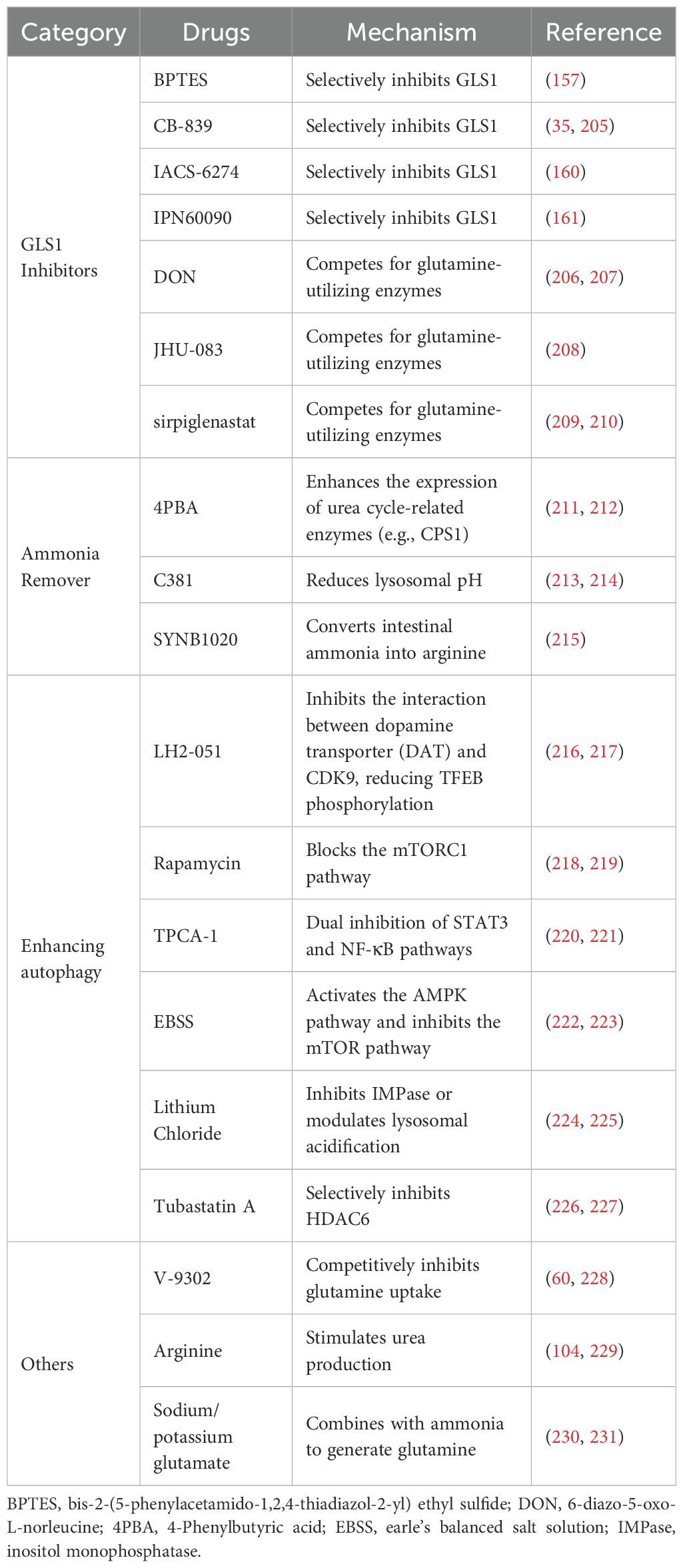 Recent studies have highlighted ammonia’s critical role in effector CD8+ T cell death (15). While glutamine metabolism provides essential energy for CD8+ T cells during immune responses, contributing carbon and nitrogen for biosynthesis, its metabolic byproduct, ammonia, gradually accumulates within the cells, ultimately leading to their demise (15, 16). To prevent ammonia-induced cell death and extend the survival of CD8+ T cells, at least three strategies have been proposed. First, since glutamine metabolism is the precursor to ammonia accumulation, inhibitors such as 6-diazo-5-oxo-L-norleucine (DON) or CB-839, a non-competitive allosteric inhibitor of GLS1, can significantly reduce intracellular ammonia levels (35, 124). Both DON and CB839 have been shown to promote Teff survival, upregulate CD25, IFN-γ, and TNF-α, and enhance the formation of memory precursor effector cells (KLRG1-CD127+) (125–127). Second, removing excess ammonia from the cell provides an alternative approach to mitigate ammonia-induced cell death. Ammonia scavengers, such as phenylbutyrate (a prodrug of phenylacetic acid), reduce ammonia levels by promoting its conversion into phenylacetyl glutamine, which is excreted in urine, thus mitigating its toxic effects (128). Additionally, upregulating the key urea cycle enzyme, carbamoyl-phosphate synthetase 1 (CPS1), which is expressed at low levels in CD8+ T cells, can significantly lower intracellular ammonia concentrations (15, 129). Third, because ammonia-induced damage to lysosomes and mitochondria directly triggers cell death, accelerating the clearance of damaged organelles or enhancing autophagy offers a promising strategy to rescue T cells. Restoring lysosomal function, for example, by activating the transcription factor TFEB using compounds like Torin1 or Metformin to upregulate lysosomal gene expression, promotes lysosome biogenesis (130–132). When lysosomal function is severely impaired, lysosome-independent degradation pathways, such as those activated by Bortezomib, a proteasome modulator, can enhance ubiquitination and proteasomal activity, compensating for defective lysosomal function and facilitating the removal of damaged proteins and organelles, thus improving immunotherapy efficacy (133) (Table 1). In summary, targeting ammonia-induced cell death can significantly prolong the survival of CD8+ T cells in the TME, enhancing their anti-tumor activity. This approach offers a promising direction for future cancer immunotherapy.