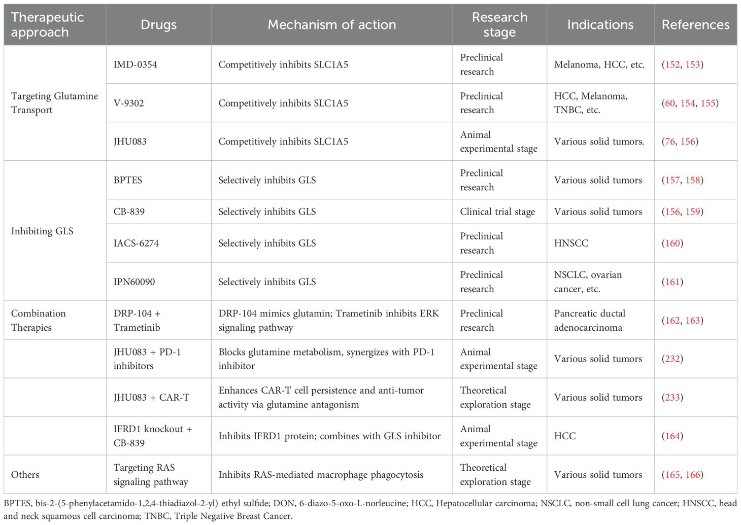 Combination therapy strategies aim to overcome the limitations of monotherapy and enhance therapeutic efficacy. Preclinical studies have demonstrated that DRP-104, a glutamine mimetic prodrug, in combination with the MEK inhibitor trametinib, effectively suppresses pancreatic ductal adenocarcinoma by simultaneously inhibiting glutamine metabolism and the ERK signaling pathway (162, 163). Furthermore, progress has been made in targeting compensatory mechanisms employed by tumor cells under glutamine deprivation. For instance, IFRD1 knockout combined with CB-839 treatment effectively inhibited the “low-cost” survival of tumor cells under nutrient stress in HCC animal models by blocking the autophagic degradation pathway of histone H1.0 (164). Other strategies, such as targeting the RAS signaling pathway to suppress its mediated dysfunction in macrophage phagocytosis, remain at the theoretical exploration stage (165, 166). These multi-pathway, multi-target intervention strategies provide new research directions and therapeutic approaches for overcoming tumor metabolic heterogeneity and microenvironment-mediated drug resistance. (Table 2).