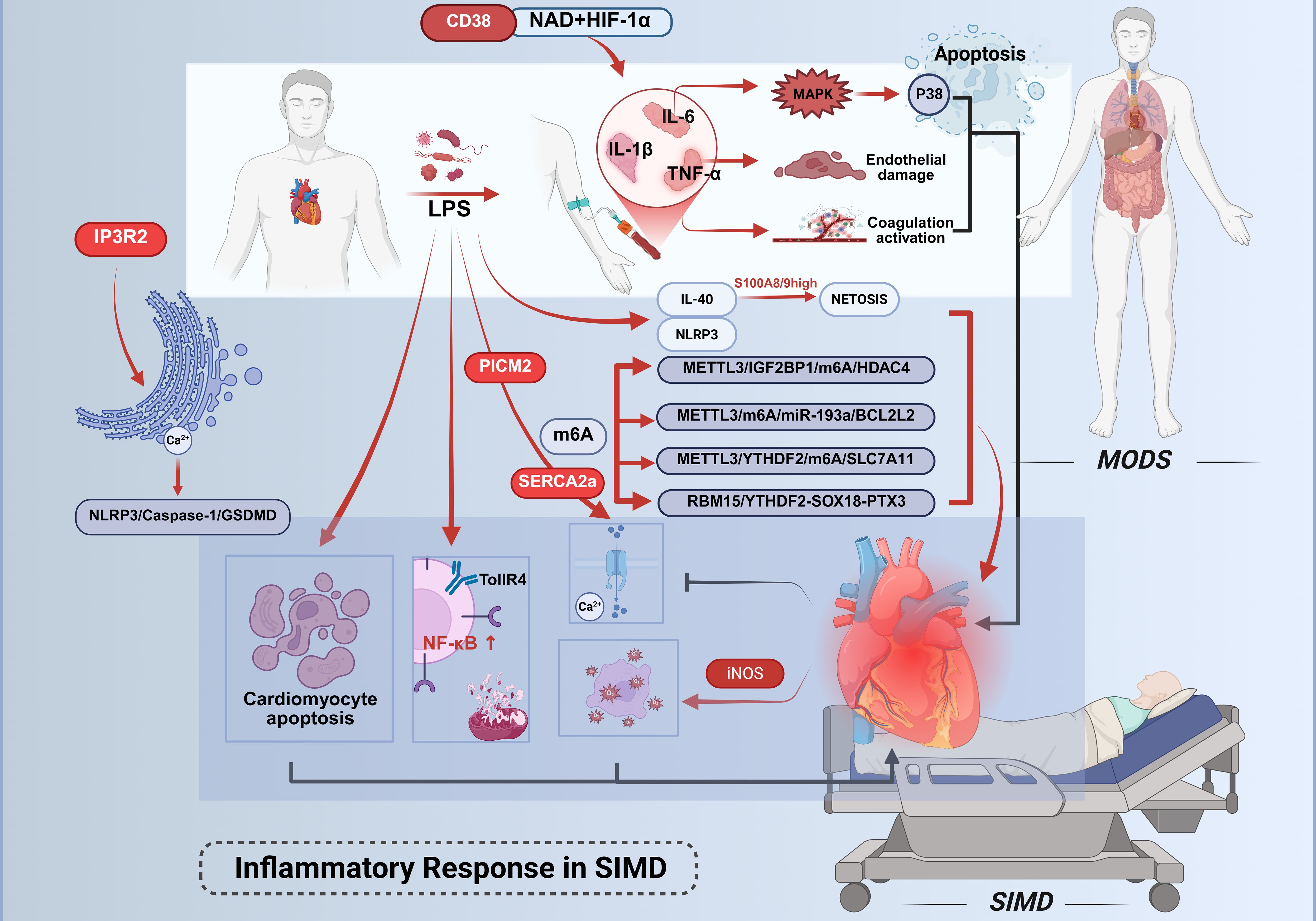 Figure 1. Inflammatory mechanisms in septic cardiac injury. Cardiac injury in sepsis is driven by inflammatory cascades initiated through Gram-negative bacterial LPS. LPS directly activates pro-inflammatory cells or binds to TLR4, triggering pathways such as NF-κB to upregulate the expression of TNF-α, IL-1β, and IL-6. TNF-α mediates primary inflammatory manifestations, while IL-6 selectively activates the p38 MAPK signaling pathway. Elevated IL-6 levels promote coagulation cascade activation and vascular endothelial dysfunction, thereby suppressing myocardial contractility. IL-40 drives sepsis progression. CD38high monocytes predict 28-day mortality in sepsis; their CD38-NAD+-HIF-1α axis drives glycolysis.Concurrently, LPS activates the NLRP3 inflammasome, accelerating multiorgan dysfunction.Central to myocardial injury regulation is m6A RNA methylation. The methyltransferase METTL3 coordinates multiple pathological processes through distinct downstream pathways, collectively exacerbating myocardial dysfunction in SIMD. This figure was created using BioRender (biorender.com).