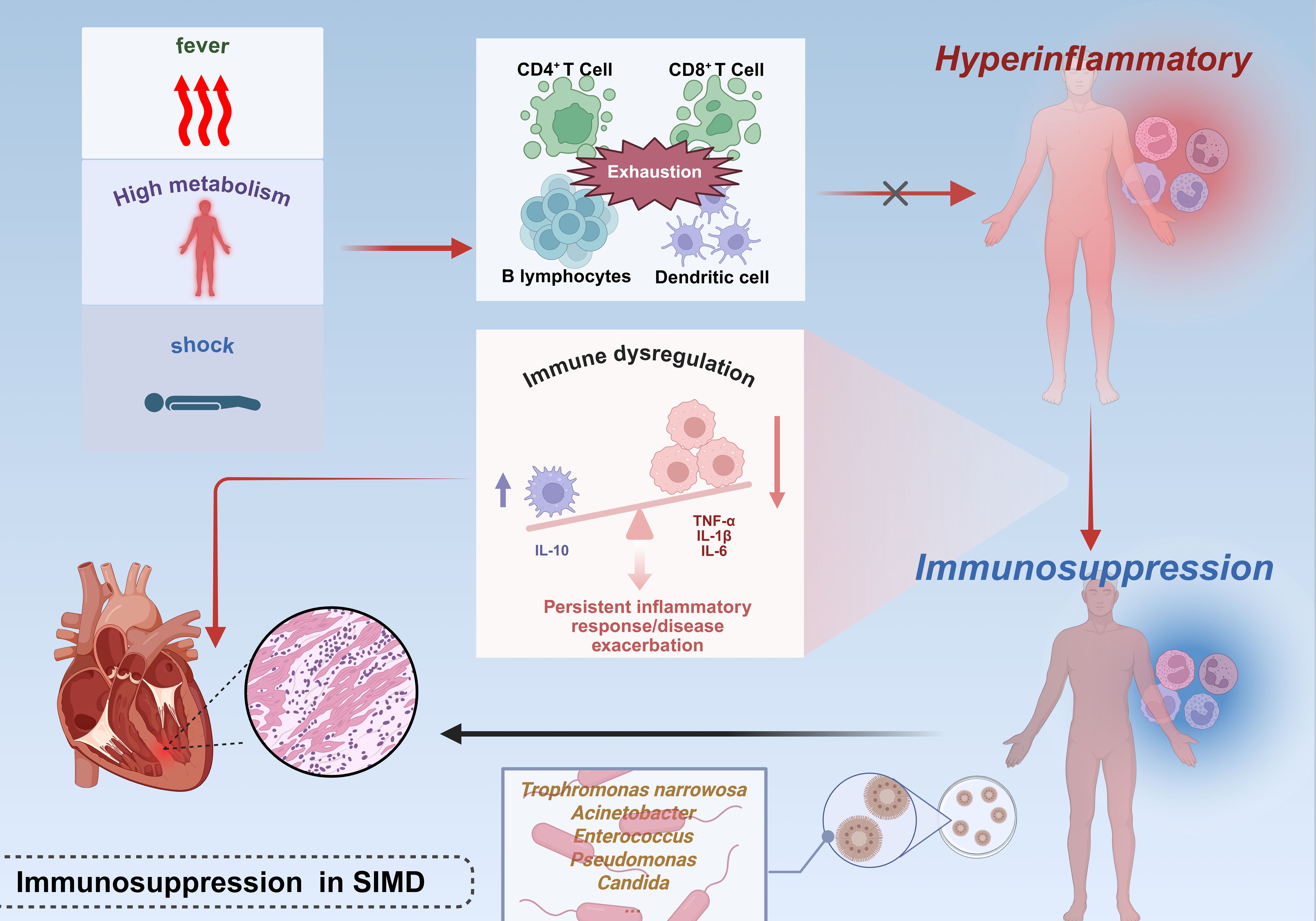 The repeated failure of clinical trials targeting inflammatory mediator blockade or pathogen recognition pathways in sepsis has substantiated the hypothesis that disease progression extends beyond hyperinflammation alone (49, 50). (Figure 2) During the progression of shock, the immune response undergoes dynamic evolution: initially presenting as SIRS (systemic inflammatory response syndrome), characterized by massive release of pro-inflammatory cytokines and widespread activation of immune cells, which aims to initiate repair but can easily lead to tissue damage; followed by CARS (compensatory anti-inflammatory response syndrome), which suppresses inflammation through anti-inflammatory mediators and upregulation of immune checkpoints to restore homeostasis, but excessive suppression may result in immune disorder and increased risk of infection; the interplay of these two states forms MARS (mixed antagonist response syndrome), manifested as immune imbalance and functional dysregulation, ultimately progressing to multiple organ dysfunction and systemic failure. These three stages constitute the core continuum of immunopathology in shock, determining the direction of clinical outcomes (51). During the early phase of sepsis, the host mounts an immune response to infection or injury, characterized by a hyperinflammatory phenotype manifesting as shock, pyrexia, and a hypermetabolic state. Concurrently, progressive immune cell exhaustion—marked by depletion of CD4+ T lymphocytes, CD8+ T lymphocytes, B lymphocytes, and follicular dendritic cells (DCs)—compromises the capacity to counteract overwhelming inflammation, thereby exacerbating disease severity (52, 53). Sepsis-induced immunosuppression exhibits two hallmark features: impaired monocytic production of proinflammatory cytokines (particularly TNF-α) upon endotoxin challenge and diminished lymphocyte proliferative capacity. Paradoxically, this occurs despite the theoretical expectation of clonal lymphocyte expansion during immune activation (54). Clinical investigations reveal elevated plasma concentrations of both proinflammatory cytokines and the potent anti-inflammatory cytokine IL-10 in septic patients (55). Notably, severe sepsis frequently presents with concurrent persistent inflammation and immunosuppression—a state termed “ Immune disorder “ (56) van Dissel et al. analyzed cytokine profiles in 464 patients, demonstrating that elevated IL-10/TNF-α ratios correlate with mortality in community-acquired infections (57). Microbiological evidence further supports impaired host immunity in sepsis. Common nosocomial pathogens in ICU settings—including Stenotrophomonas maltophilia, Acinetobacter spp., Enterococcus spp., Pseudomonas aeruginosa, and Candida spp.—are frequently low-virulence or opportunistic organisms, serving as biomarkers of profound immunosuppression (58, 59).(Table 1) This immunosuppressive milieu perpetuates inflammatory persistence and drives clinical deterioration through multiple mechanisms: secondary infections amplify systemic inflammation, while inflammation-mediated pathologies exacerbate organ dysfunction, culminating in cardiac failure and mortality. Postmortem analyses of sepsis fatalities reveal marked immunosuppression, characterized by reduced cytokine production (via upregulation of inhibitory receptors on organ-infiltrating T cells) in splenic and pulmonary immune cells (60). Notably, sustained infection per se does not fully account for sepsis-related mortality (61). Experimental evidence establishes a causal link between immune effector cell loss and outcomes. Multiple independent studies demonstrate that anti-apoptotic therapies preserve immune effector populations and improve survival in clinically relevant sepsis models (62–64). The impact of sepsis on the heart extends far beyond the acute phase, as the myocardial dysfunction it induces persists even after patients are discharged from the hospital and significantly increases long-term cardiovascular risk. This process begins with myocardial damage caused by the cytokine storm and myocardial depressant factors during the acute phase, while the long-term effects stem from persistent immune-inflammatory disturbances and accelerated vascular aging mechanisms. The latter, through oxidative stress and aging signaling pathways such as p53/p21 and p16, promotes endothelial dysfunction and the progression of atherosclerosis, ultimately leading to a significant increase in the risk of major adverse cardiovascular events (such as heart failure, myocardial infarction, and stroke) in survivors. Therefore, the cardiac damage caused by sepsis is actually a continuous pathological process that extends from acute injury to chronic cardiovascular disease, and requires long-term monitoring and intervention (65). Despite these advances, the precise mechanisms underlying immunosuppression in SIMD remain incompletely elucidated.