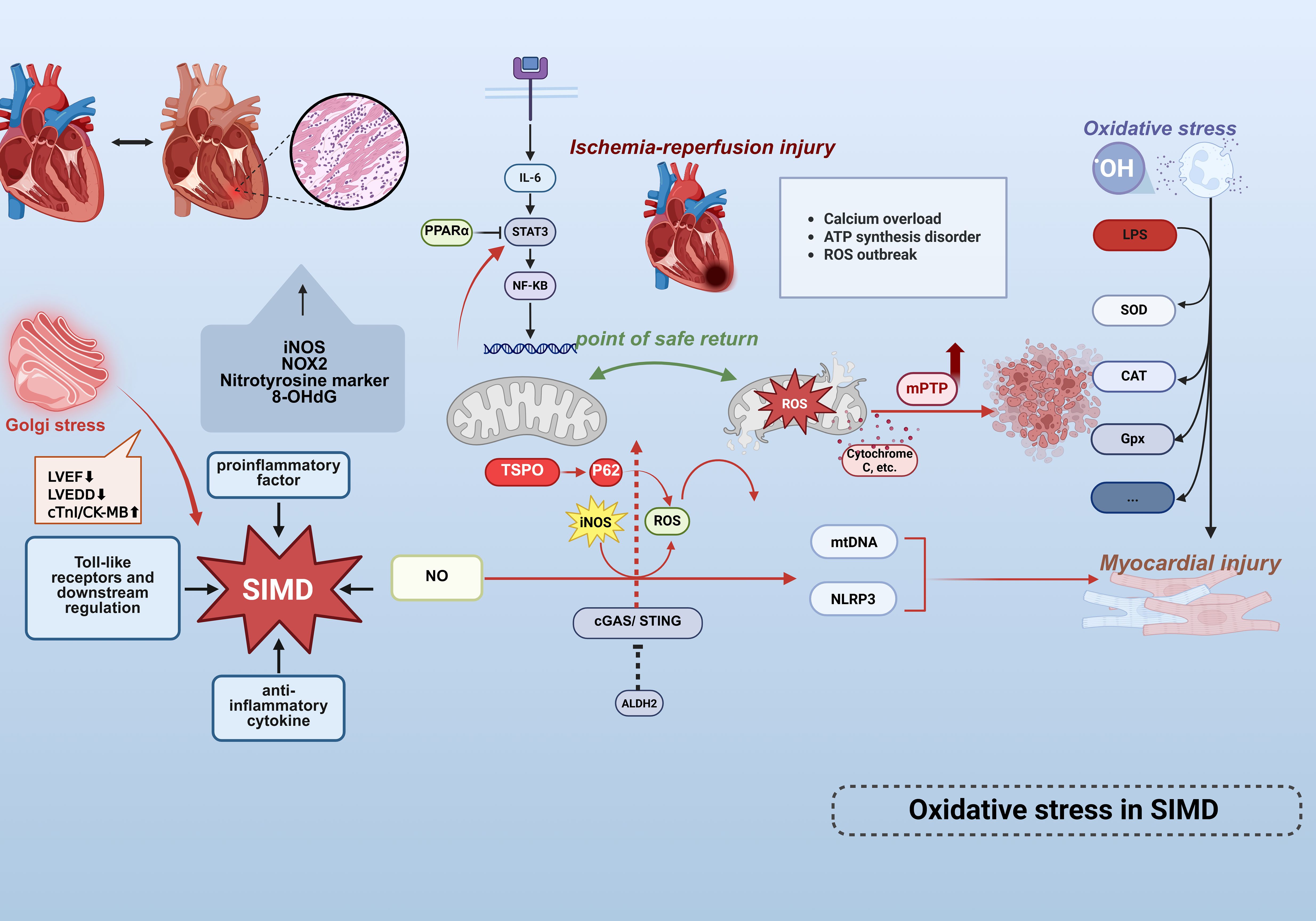 Figure 3. Oxidative stress mechanisms in septic cardiac injury. Cardiac tissue from non-surviving septic patients exhibits marked upregulation of iNOS, NOX2, nitrotyrosine, and 8-OHdG, highlighting the central role of OS/NS in myocardial injury.Golgi stress (inflammation/apoptosis) exacerbates sepsis-induced myocardial dysfunction (SIMD) characterized by LVEF reduction, LVEDD elevation, and cTnI/CK-MB elevation. Infiltrating leukocytes excessively release free radicals, directly damaging cardiomyocytes.LPS-induced overproduction of ROS activates the NLRP3 inflammasome, mediating cardiomyocyte death and exacerbating injury. Concurrently, ROS disrupt mitochondrial membrane potential, triggering mtDNA release as DAMPs that further amplifies inflammatory cascades. This sustained ROS generation activates the IL-6/STAT3/NF-κB signaling pathway, propagating inflammatory responses.The endogenous antioxidant defense system is compromised via reduced expression of SOD,CAT, and GPx. Conversely, mitochondrial ALDH2 mitigates LPS-induced cardiac dysfunction, inflammation, and apoptosis by suppressing the cGAS/STING pathway. SIMD is driven by ischemia/reperfusion injury, involving oxidative stress, mitochondrial dysfunction (mPTP opening), and microcirculatory disturbances. The safe return point defines the intervention window, and mPTP inhibition may provide protection.These findings collectively establish oxidative stress and mitochondrial dysfunction as core mechanisms driving cardiac involvement in sepsis. This figure was created using BioRender (biorender.com).