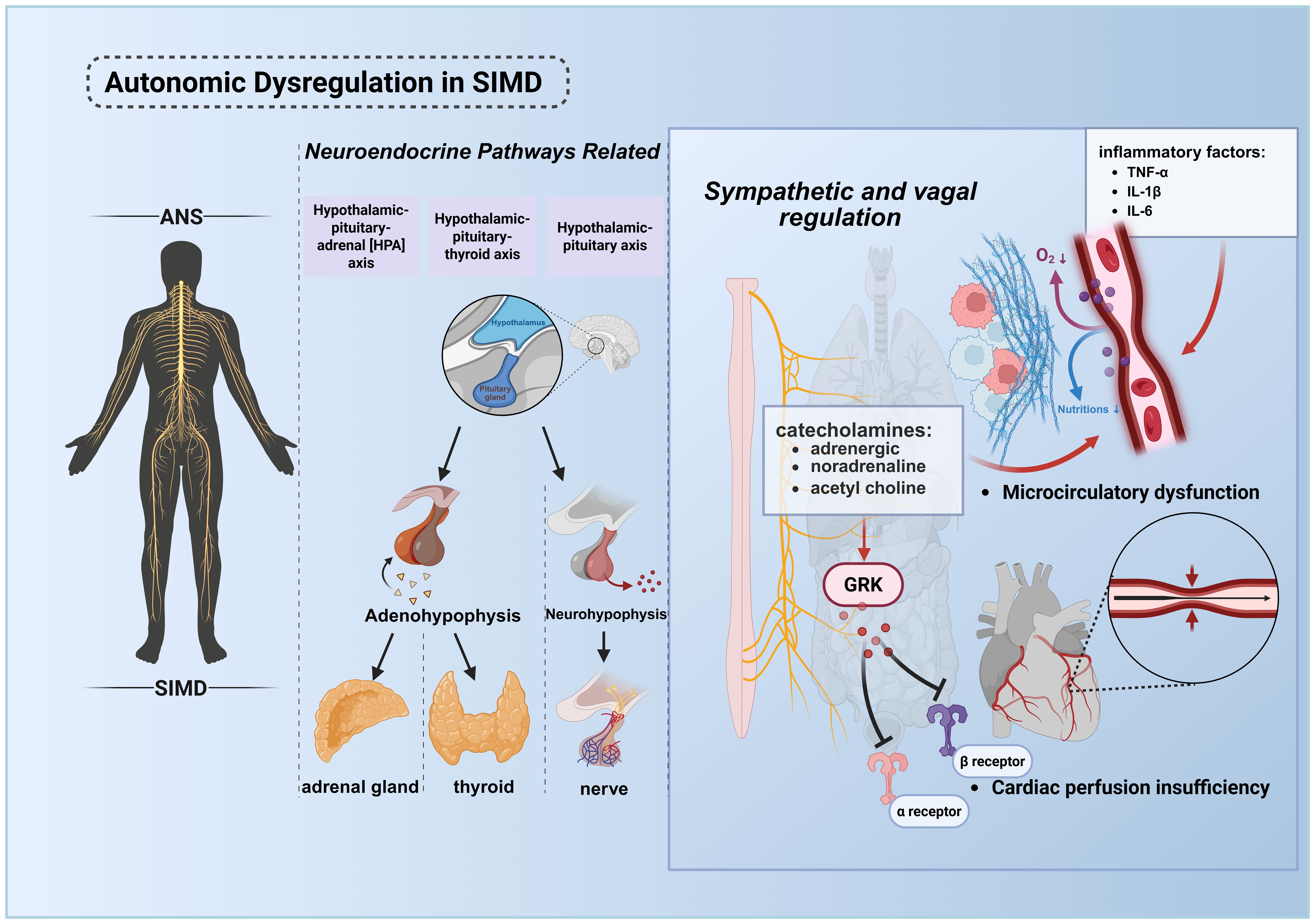 Figure 4. Pathological mechanisms of ANS dysregulation in septic cardiac injury. The ANS maintains systemic homeostasis by regulating cardiac output, vascular tone, inflammatory responses, immune equilibrium, and energy metabolism. During sepsis, infection or tissue injury activates the central nervous system, triggering the HPA axis, hypothalamic-pituitary-thyroid axis, and hypothalamic-neurohypophysial axis to orchestrate stress responses. ANS dysregulation, coupled with elevated inflammatory mediators (e.g., cytokine storm), synergistically promotes microcirculatory disturbances, culminating in multiorgan failure, including cardiac dysfunction. In septic shock, desensitization of adrenergic receptors leads to myocardial depression and vascular paralysis, exacerbating the vicious cycle and increasing mortality. This figure was created using BioRender (biorender.com). ANS, The autonomic nervous system.
