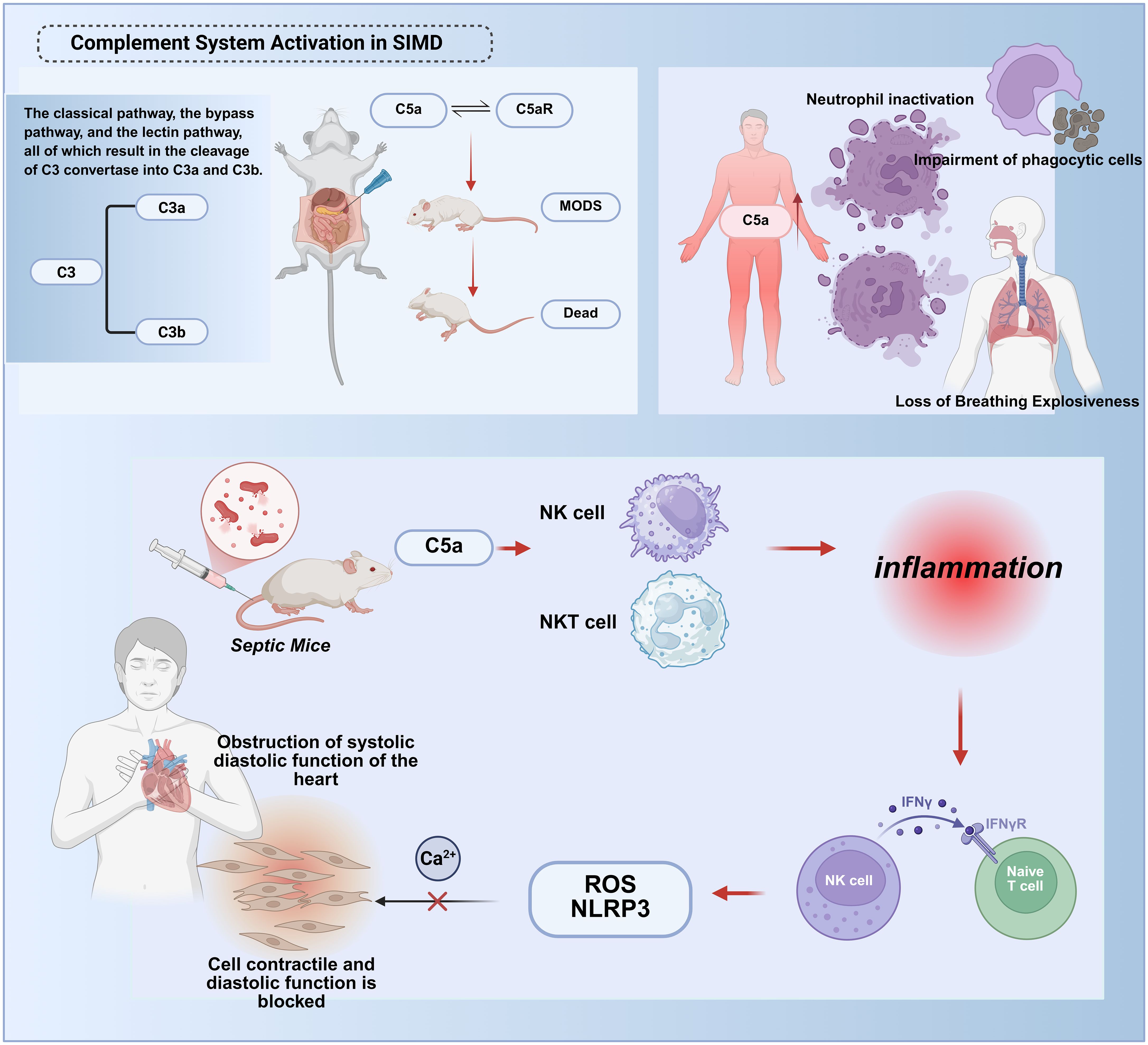 Figure 5. Molecular mechanisms of complement system hyperactivation in septic cardiac injury. The complement system exerts dual roles in sepsis. During early stages, activation via the classical, alternative, or lectin pathways cleaves C3 into C3a/C3b, facilitating pathogen clearance and immune regulation. However, excessive late-phase activation drives systemic inflammation and tissue injury.In early sepsis, the complement activation product C5a binds to the C5a receptor (C5aR), Myocardial pyroptosis and dysfunction:C5a activates the reactive oxygen species/NOD-like receptor protein 3 (ROS/NLRP3) inflammasome pathway, inducing cardiomyocyte pyroptosis;Disrupted intracellular calcium homeostasis impairs myocardial contraction/relaxation.Immune dysregulation:C5a activates natural killer (NK) and NKT cells, amplifying cytokine storms (e.g., TNF-γ release) and recruiting immune cells to infection sites.These synergistic mechanisms culminate in irreversible myocardial damage and cardiac failure. This figure was created using BioRender (biorender.com).