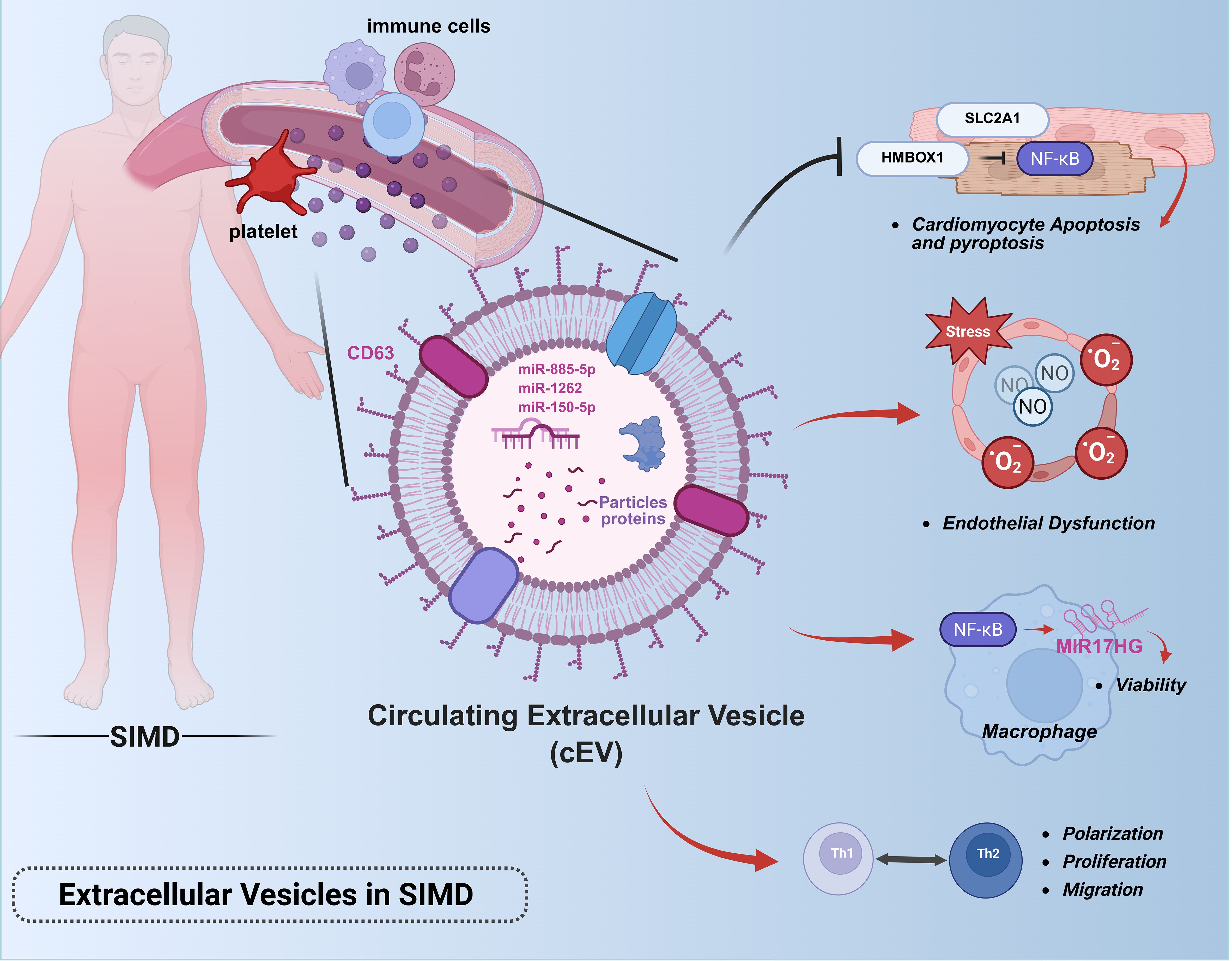 Figure 6. Roles of extracellular vesicles in sepsis-induced myocardial dysfunction.This figure illustrates the pathophysiological role of extracellular vesicles in sepsis-associated cardiac injury: Circulating EVs derived from immune cells (e.g., neutrophils, macrophages) propagate systemic inflammation by delivering pro-inflammatory cargo (miRNAs, cytokines, DAMPs) to cardiomyocytes and endothelial cells.Key pathways include miR-885-5p/HMBOX1/NF-κB-mediated pyroptosis, TLR4/NF-κB activation in macrophages via MIR17HG, and miR-1262/SLC2A1-driven metabolic dysregulation.Platelet-derived EVs exacerbate endothelial dysfunction through NO and superoxide overproduction.Note: This figure was created using BioRender (biorender.com).