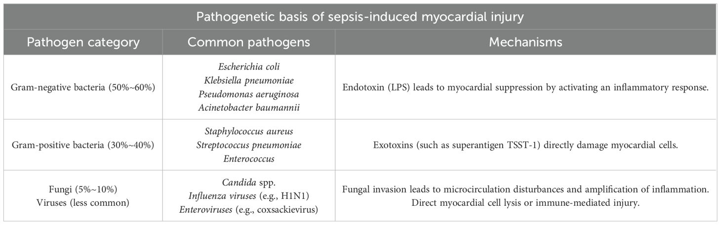 Table 1. Septic myocardial disease is mainly induced by infections from the following pathogens, predominantly bacteria, with occasional occurrences of fungi or viruses.