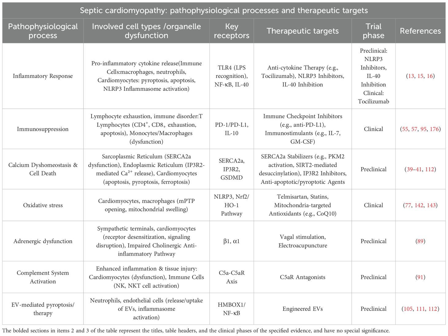 Cardiac dysfunction, a critical determinant of outcomes in sepsis-induced systemic inflammation and multiorgan failure, remains a therapeutic challenge. Current anti-inflammatory strategies—including tocilizumab and corticosteroids—are constrained by narrow therapeutic windows (requiring early intervention), high interpatient heterogeneity (necessitating biomarker stratification), and insufficient targeting (e.g., broad-spectrum antibiotics’ inability to modulate immunity precisely). The central dilemma in sepsis immunotherapy lies in balancing anti-inflammatory and immunostimulatory interventions temporally, necessitating a paradigm shift from “one-size-fits-all” approaches to individualized, phase-specific therapies. Notably, sepsis-induced immunosuppression exhibits organ-specific patterns (e.g., more pronounced T-cell exhaustion in spleen versus lung), while immunostimulants risk triggering cytokine rebound (e.g., IFN-γ overactivation). Targeted interventions addressing these spatiotemporal dynamics could overcome current limitations, transitioning therapeutic goals from survival improvement to functional immune reconstitution. Recent translational advances have elucidated pathophysiological mechanisms and propelled novel therapies from bench to bedside, with ongoing clinical trials focusing on three pillars of septic cardiomyopathy: myocardial suppression, microcirculatory dysfunction, and metabolic dysregulation. (Table 3).