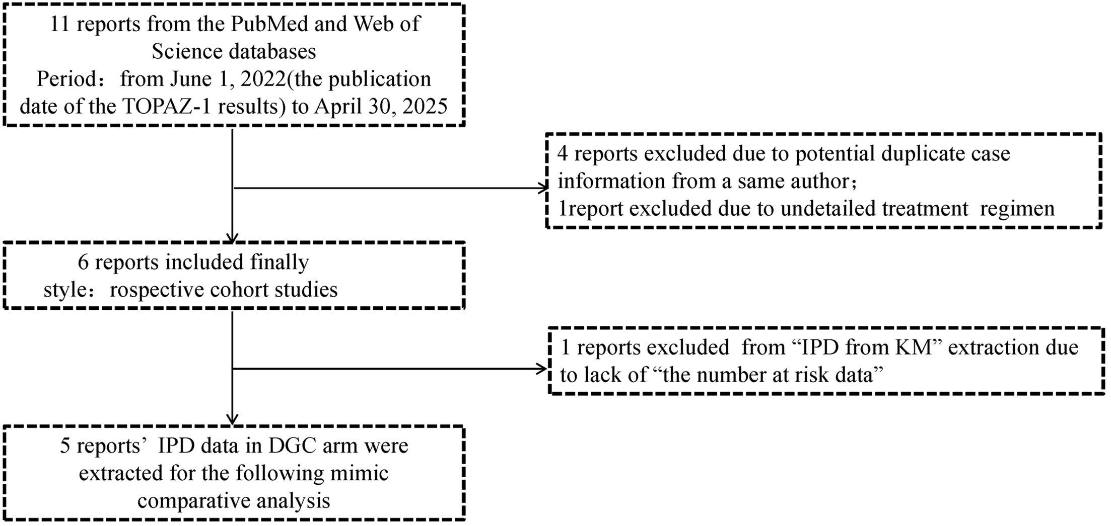 In this mimic comparative analysis by survival data reconstruction, a total of 11 studies were initially collected. A systematic search was conducted on PubMed and Web of Science from June 1, 2022 (the publication date of the TOPAZ-1 results), to April 30, 2025. Search terms included “durvalumab”, “real-world or real life”, “biliary tract cancer or BTC or cholangiocarcinoma”, “gallbladder cancer”, “unresectable or metastatic or advanced”. Each record was screened by two authors (Hong-xiang Ji and Ma-Hui Si). Considering the duplicate case information, four previous reports from a same author (Rimini M) were excluded. Another report was excluded due to an unclear treatment regimen, resulting in the final inclusion of 6 reports. This study was conducted following the Preferred Reporting Items for Systematic Reviews and Meta-Analyses (PRISMA) reporting guideline for individual patient data (IPD). (14, Supplementary 1).