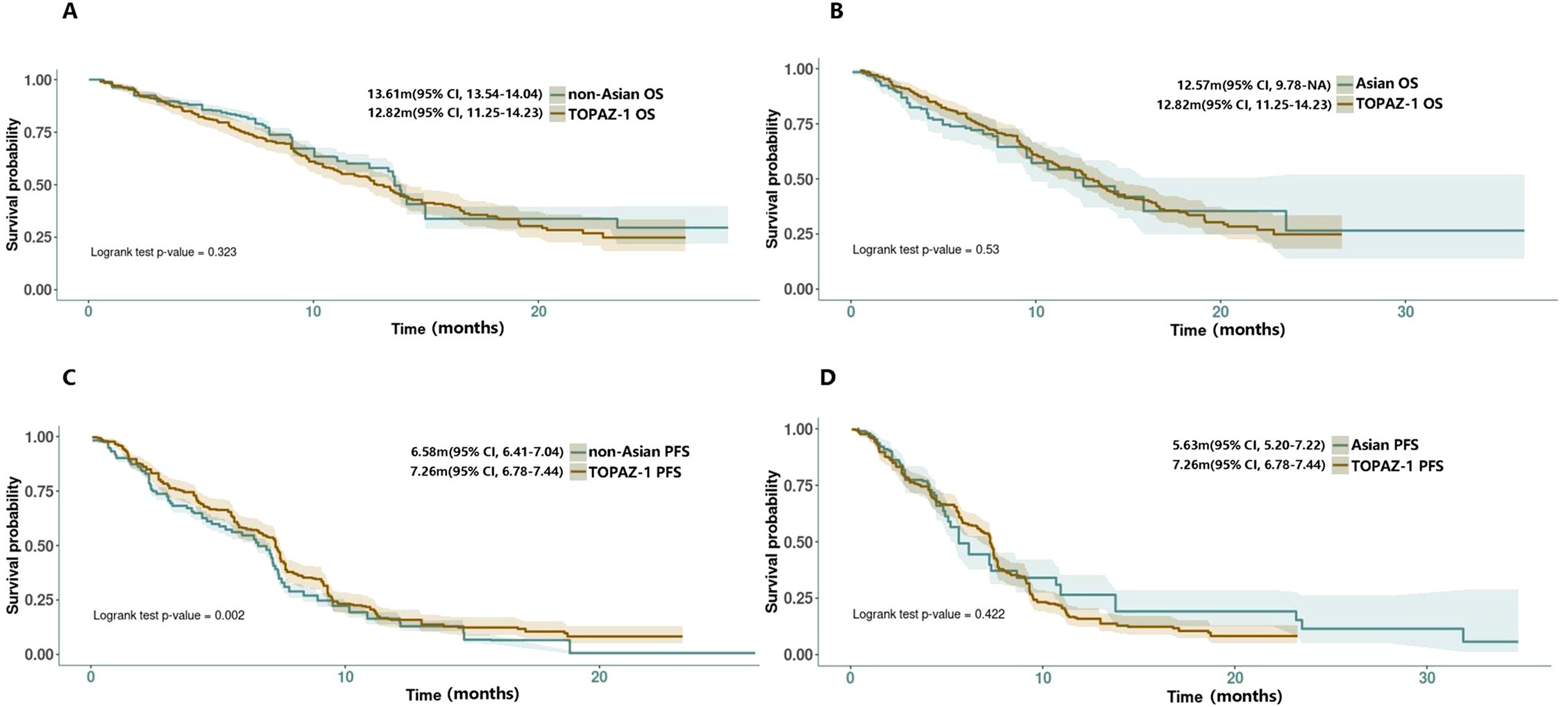 Figure 2. (A, B) Reconstructed OS curves for comparison between non-Asian/Asian group with TOPAZ-1 DGC arm. (C, D) Reconstructed PFS curves for comparison between non-Asian/Asian groups with the TOPAZ-1 DGC arm.