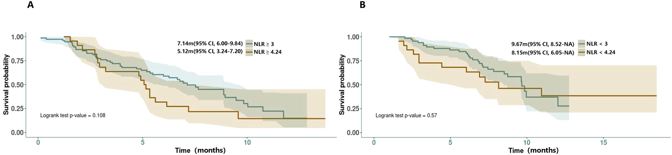 In the real-world clinical scenarios, various factors have been reported as valuable references for prognosis (Table 5). According to Muddu et al. (2024) (8), factors such as sex, ECOG-PS, BTC subtype, tumor differentiation, durvalumab cycle frequency, chemotherapy dose interruptions, and immunotherapy dose interruptions all did not affect the overall survival, although a lower mOS was observed in the GBC subset. Its multivariable analysis showed that age <60 years and standard dose of durvalumab were associated with improved OS. Patients <60 years had a mOS of 23.5 months compared with 9.5 months for those age ≧ 60 years (P = 0.002). In the study, 10.8% of patients received durvalumab at a dose lower than 1,500 mg (most at 500 mg/3 weeks) due to logistical and cost reasons. The mOS for patients on the standard dose was 12.1 months, compared with 7.5 months for those on alternative doses. In Reimann et al. (2024) (26), age <65 years was significantly associated with improved OS. In Huang et al. (2024) (21), a restricted cubic spline (RCS) analysis suggested a similar efficacy between doses of 1,000 and 1500 mg but potentially worsened at doses less than 1,000 mg, although not statistically significant. They also found a high NLR (≧4.24) to be associated with poor survival outcomes, a finding supported by Rimini et al.’s previous research (18), in which 25.4% of the patients with NLR≧3 had PD compared with 4.5% of patients with NLR<3 (p=0.002), and 23.2% of patients with ECOG PS > 0 had progression versus 8.2% of patients with ECOG PS = 0 (p=0.02) at the first CT scan. As the NLR-related PFS KM curves were provided by Rimini et al. (18) and Huang et al. (21) and with the attempt to find a more credible threshold, we also conducted a reconstruction of NLR-related survival data for comparison (NLR≧4.24 vs. ≧3; NLR≦4.24 vs. ≦3). However, the result showed no statistical significance between them (NLR≧4.24 vs. ≧3: 5.12m vs. 7.14m, HR = 1.56, 95% CI:0.90-2.70, log rank P = 0.108; NLR≦4.24 vs. ≦3: 8.15m vs. 9.67m, HR = 1.22, 95% CI: 0.61-2.44, log rank P = 0.57) (Figure 4). In the latest research from Rimini et al. (2024) (20), factors such as high baseline CA-199, high baseline CEA, and metastatic disease at initial were also found to affect the survival outcomes with statistical significance.