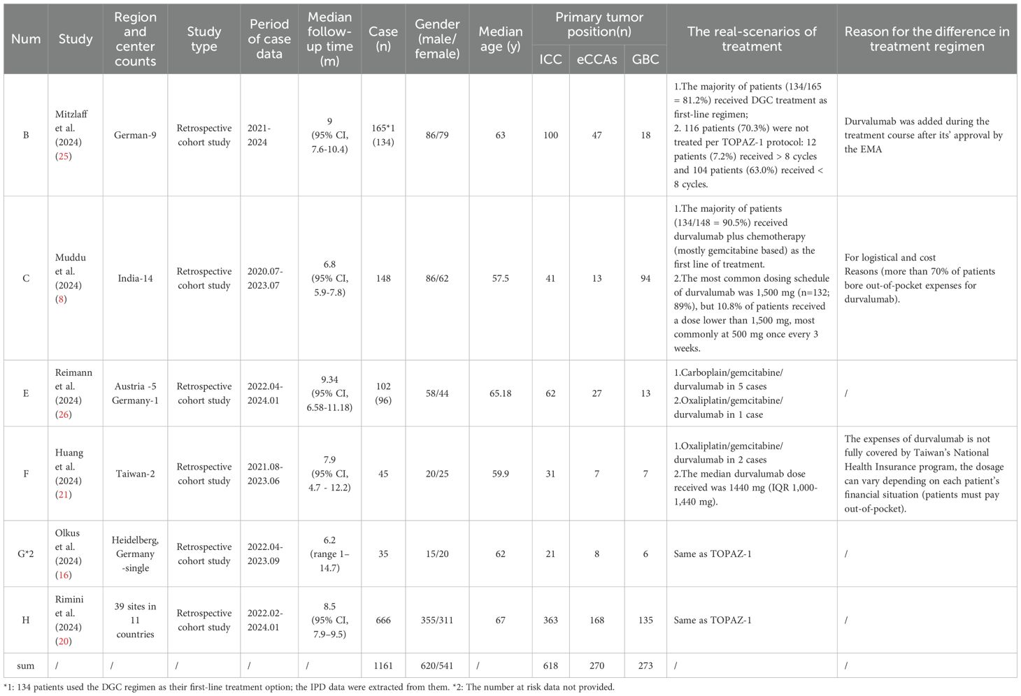 However, due to the highly selected patient population enrolled in the TOPAZ-1 trial, it may not reflect the real-world clinical scenarios. During or after the TOPAZ-1 study, multiple centers worldwide actively attempted to implement this treatment regimen. Following the release of the TOPAZ-1 results, various real-world clinical outcomes were reported and compared with those from TOPAZ-1. However, international collaboration in this field remains limited. Therefore, this study gathered results from recent global real-world clinical studies on durvalumab plus chemotherapy, reconstructed the patient survival data by utilizing their KM curves, and conducted simulation comparative analysis. The aim is to provide more real-world insights into the effectiveness of durvalumab in the treatment of advanced BTC.