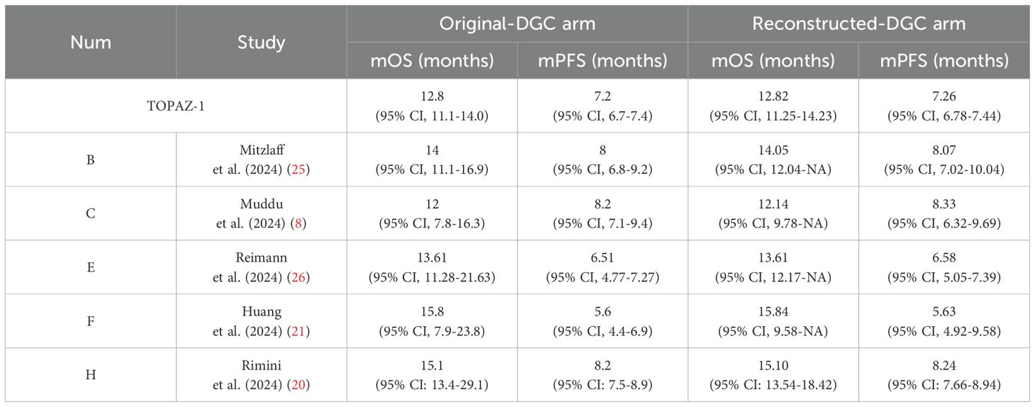 Before conducting the mimic survival comparisons, the patient-level data in the durvalumab plus chemotherapy arm from the TOPAZ-1 and the five included reports were reconstructed first to confirm the feasibility of the methods used in this analysis. For TOPAZ-1, the reconstructed median OS was 12.82 months (95% CI, 11.25-14.23) (original: 12.8 months [95% CI, 11.1-14.0]) and median PFS 7.26 months (95% CI, 6.78-7.44) (original: 7.2 months [95% CI, 6.7-7.4]). The comparison of the reconstructed data with the original outcomes for the five included reports were shown in Table 2. Based on this results, our reconstructed Kaplan–Meier survival curves demonstrated satisfactory repeatability compared with the original curves and datasets.