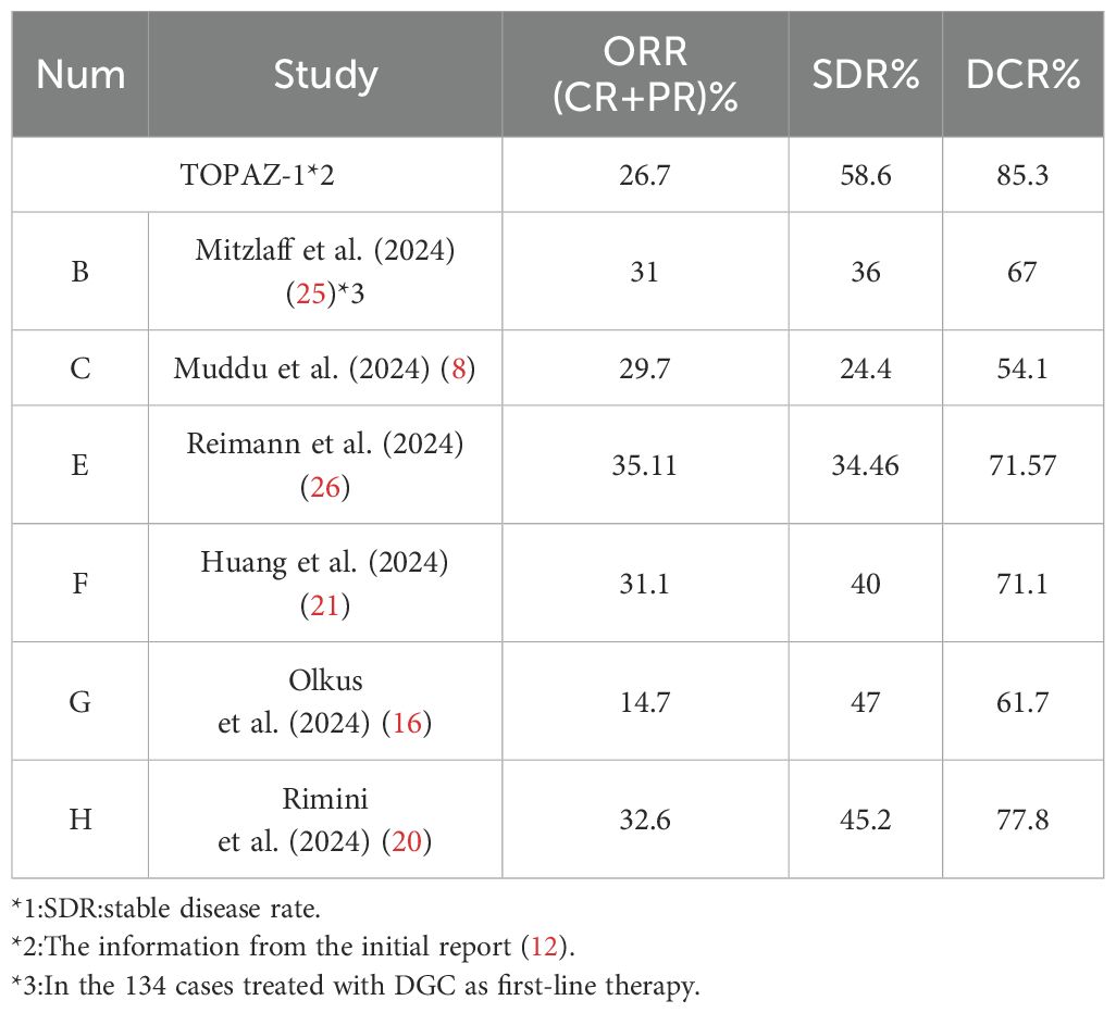 Table 3 illustrates the ORR (overall response rate), SDR (stable disease rate), and DCR (disease control rate) of the DGC arm in real-world reports. It is evident that in real-world clinical scenarios, the DCR was not so favorable as it is in the TOPAZ-1 trial. However, in the TOPAZ-1 trial, the overall survival, including long-term survival, improved for participants who achieved disease control in the DGC arm, whether CR (complete response) or PR (partial response) or SD (stable disease). The results from real-world reports are largely consistent with this and even showed more pronounced outcomes. In Muddu et al. (2024) (8), the mOS in patients who achieved clinical benefit was 23.1 months (95% CI, 10.2-36), obviously longer than 7.6 months (95% CI, 1.6-13.5) in patients who had PD (progressive disease) during treatment (p=0.002). In Reimann et al. (2024) (26), the patients who achieved at least a PR got a mOS of 14.14 months (95% CI, 13.55-NR). For the patients with SD, the mOS was 12.20 months (95% CI, 10.52-NR), and for those with PD, it was 8.52 months (95% CI, 5.46-NR). Patients with CR or PR, demonstrated significantly better overall survival compared with non-responders (HR: 0.29; 95% CI: 0.12-0.72; p=0.007). In Huang et al. (2024) (21), the responders, who had at least a PR or SD≧6 months, had a mOS of 15.8 months, whereas the non-responders, who had SD <6 months or PD, had a mOS of only 3.3 months.