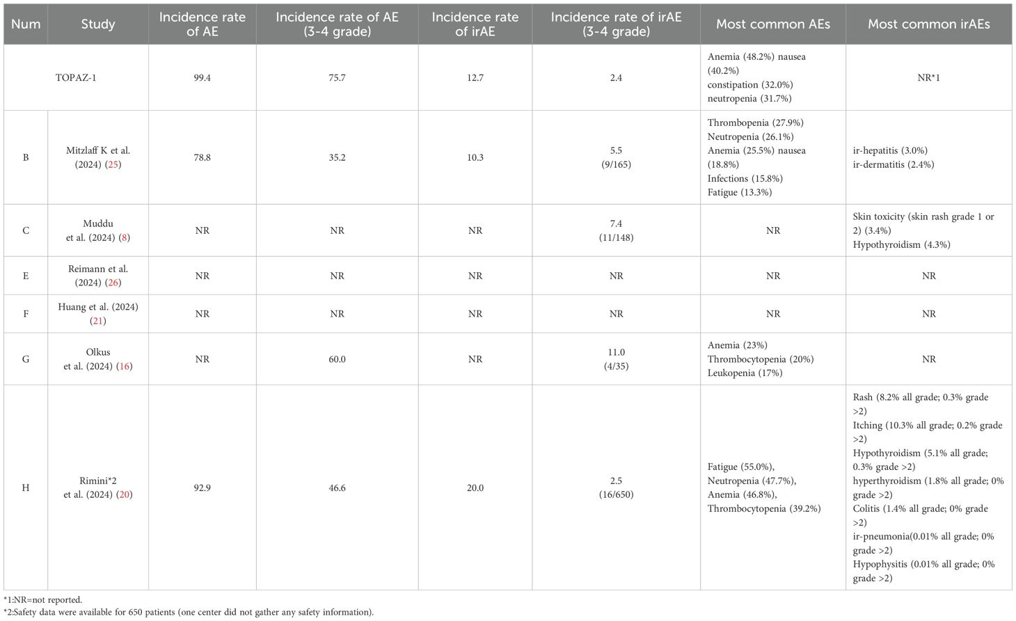 However, in real-world clinical scenarios, some differences may exist, especially in irAEs (Table 4, Figure 3). The most common adverse events seen in the DGC arm were fatigue (26.01%), leukopenia (24.64%), anemia (24.30%), and thrombocytopenia (21.14%) calculated based on the reported real-world data. The incidence rate of irAEs (3–4 Grade) calculated based on the reported data in our study is 4.0% (40/998) in the DGC arm. Among included reports, the most common irAEs were skin or thyroid related toxicity, and all 3–4 grade irAEs can be well managed with corticosteroids or immunosuppressants. Considering that the incidence of irAEs was more likely associated with the addition of durvalumab, researchers have also paid attention to the correlation between irAEs and survival outcomes. In Mitzlaff et al. (2024) (25), the occurrence of irAEs was found to be associated with a slight trend of better outcome with a mOS not reached versus 12 months (95% CI, 9.3-14.7; p=0.35) and mPFS of 11 months (95% CI, 3.4-18.5) versus 8 months (95% CI, 7.1-8.9; p=0.401). However, the response rates was not significantly different between patients with irAEs or not.