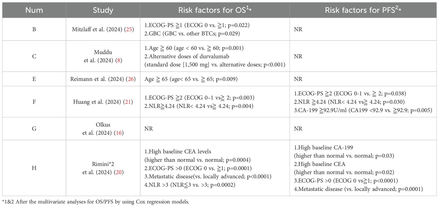 In TOPAZ-1, no clear indication of prognostic risk factors were identified. However, in real-world clinical settings, this issue cannot be overlooked. Among those real-world reports, ECOG-PS, age, alternative doses of durvalumab, NLR, baseline CEA level, baseline CA-199 level, and metastatic disease were found to be factors affecting patients’ OS or PFS. It is noteworthy that NLR has been mentioned in multiple reports, indicating its potential as a predictive marker for patients’ survival benefit under DGC regimen. Previous studies have shown that NLR plays a prognostic role in various solid tumors treated with systemic therapy, particularly ICIs (20). Now, NLR has been widely recognized as a possible surrogate of systemic inflammatory status. Tanaka et al. demonstrated a negative correlation between NLR and CD8+T cells which are crucial for the antitumor immune response (30). More investigations are needed for the confirmation of its predictive role.