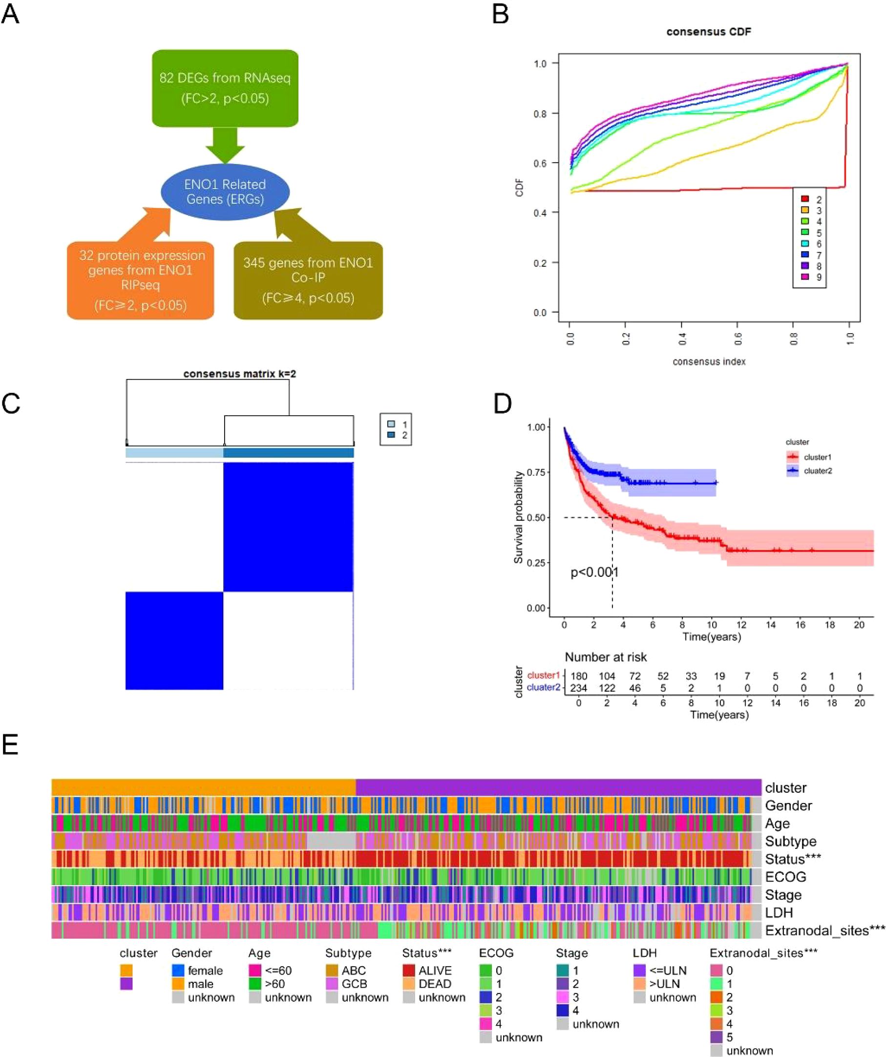 Figure 1. Identification of ENO1-related genes (ERGs) and consensus clustering analysis of identified ERGs in the GSE10846 dataset. (A) Differentially expressed genes between the Daudi and Daudi-shENO1 groups, protein expression genes from ENO1 RIPseq, and ENO1-interacting protein genes from Co-IP were selected as ERGs. (B) Consensus matrix heatmap defining two clusters (k = 2). (C) Consensus clustering cumulative distribution function (CDF) with k values ranging from 2–9 in the GSE10846 dataset. (D) KM curve for the two clusters. (E) Differences in clinical characteristics between the two distinct clusters.